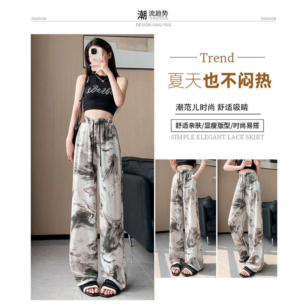 กางเกงลำลองสตรี สไตล์จีนใหม่ ลายพิมพ์ภาพวาดทิวทัศน์พู่กันจีน เชือกรูดปรับได้ สวมใส่สบาย แมทช์ง่าย ไม่เน้นรูปร่าง