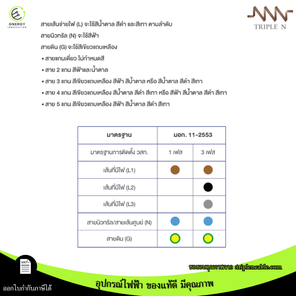 Triple NสายไฟTHW 1x1.5 Sq.mm.ทองแดงแท้ 100% มอก.11 เล่ม3-2553 มีหลายสี 30/50/100 เมตร