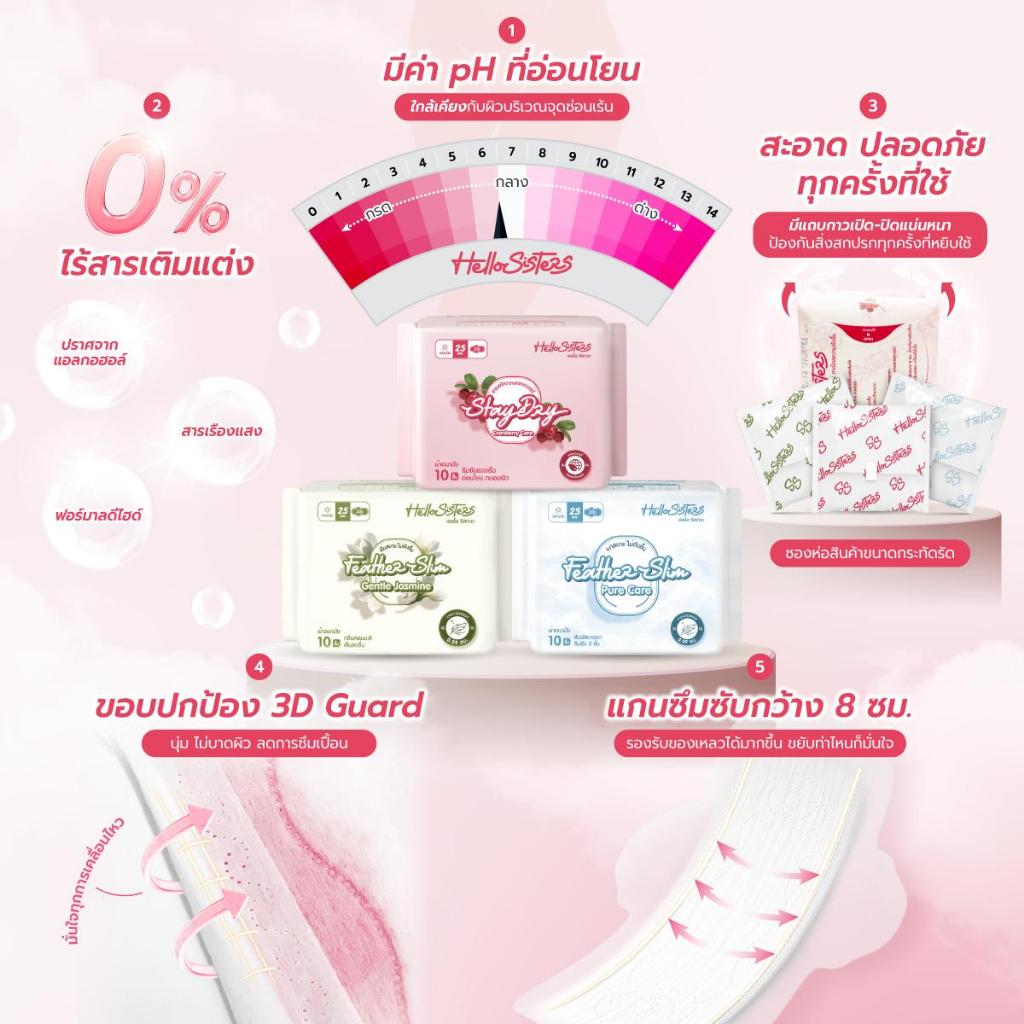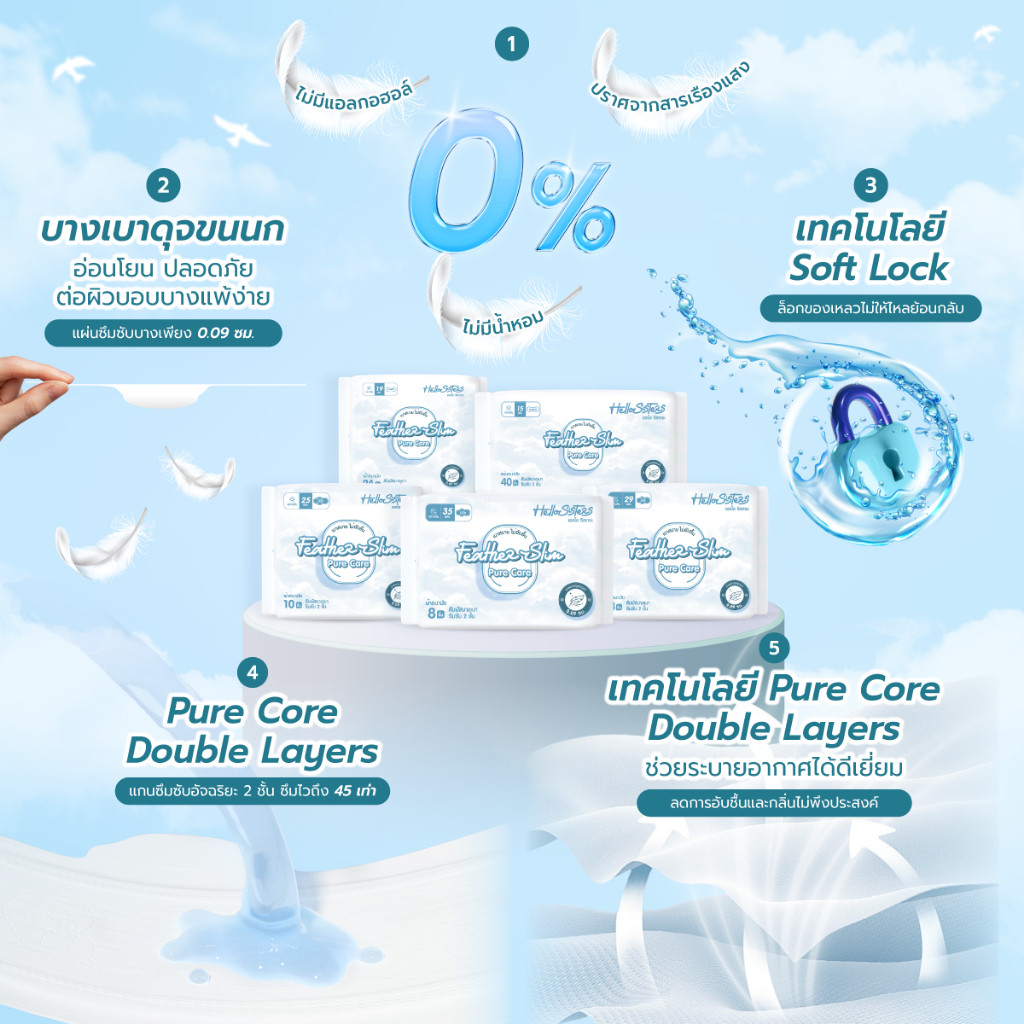 [เลือกความยาวเลย] 2 แถม 1 Feather Slim Pure Care HelloSisters เฮลโล ซิสเทอะ ผ้าอนามัย มีปีกและไม่มีปีก 15-35 ซม.