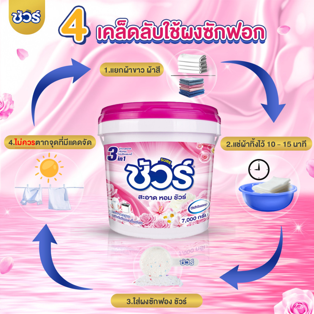 SURE ผงซักฟอก 4in1 ชัวร์ 7kg ฆ่าเชื้อ 99.9➕ขจัดคราบสกปรก➕ ป้องกันการตกสีห➕อมสดชื่น 72 ชั่วโมง