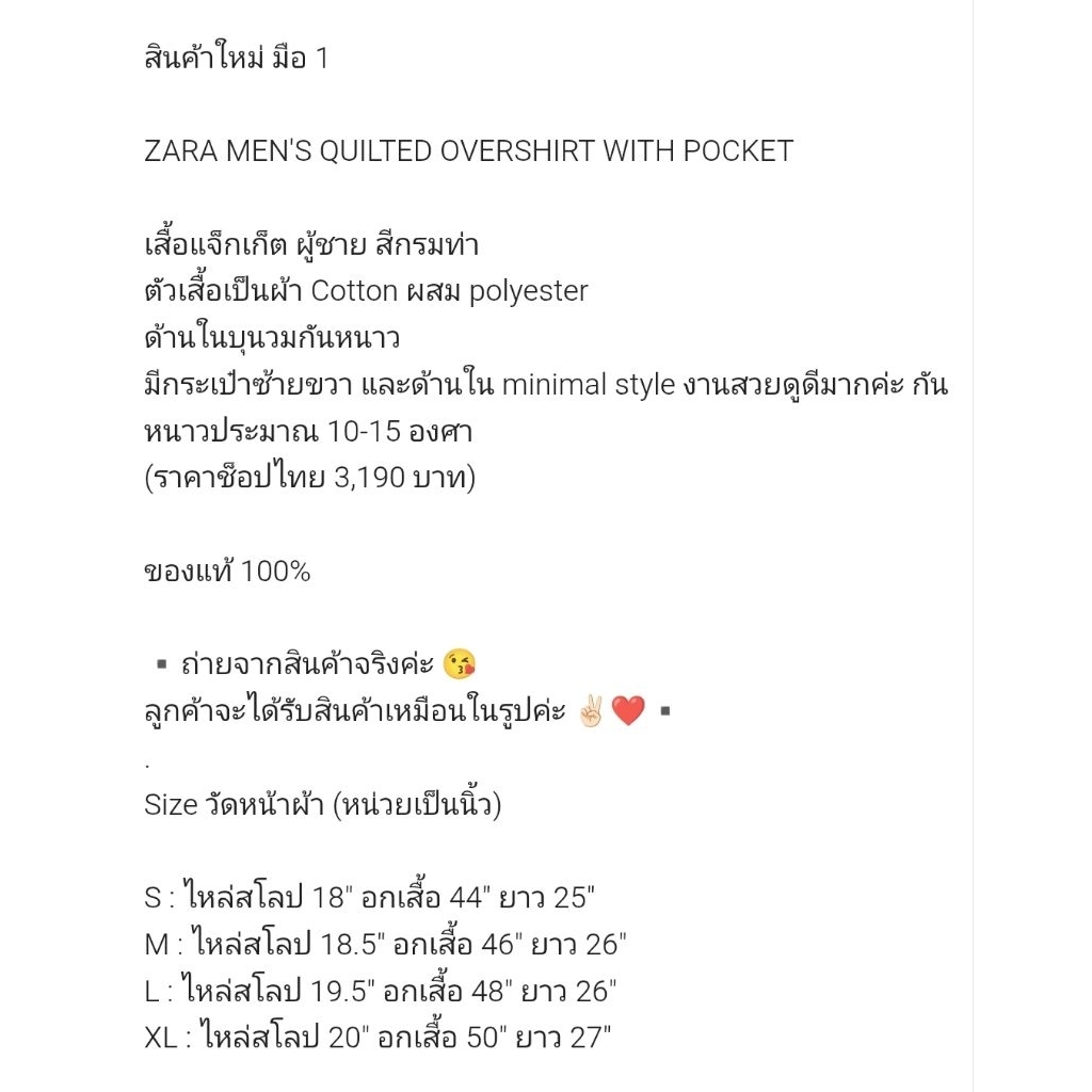 **ของแท้พร้อมส่งจากไทย**ZARA MEN'S QUILTED OVERSHIRT WITH POCKET