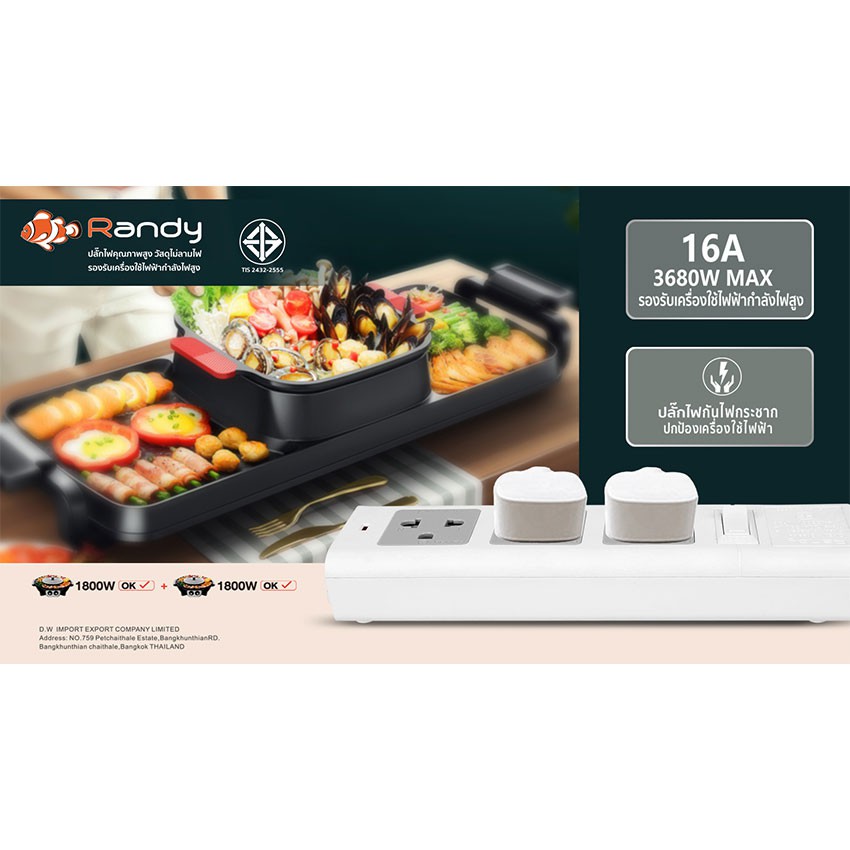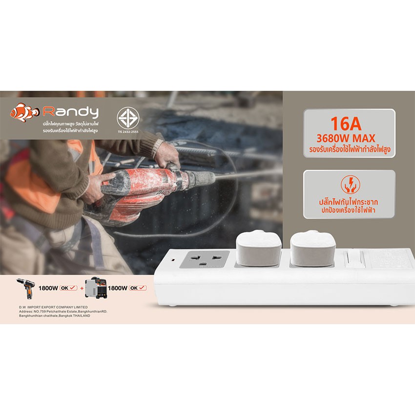 แรนดี้ ปลั๊ก พ่วงสี 3 ช่อง 1 สวิทช์ 16 แอมป์ ยาว 3 เมตร RANDY PLUG 3 SOCKET 1 SWITCH 16 A 3 M