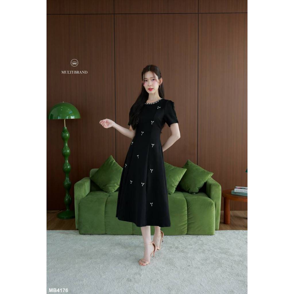 งานป้าย Multibrand 4176 {S-7XL} (ป้ายแท้) เดรสยาวทรงบาน สีพื้น แต่งอะไหล่เพชร