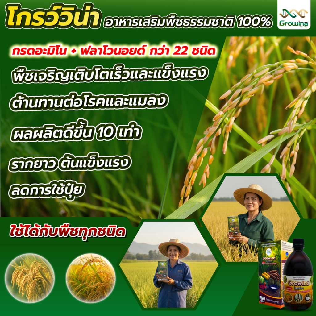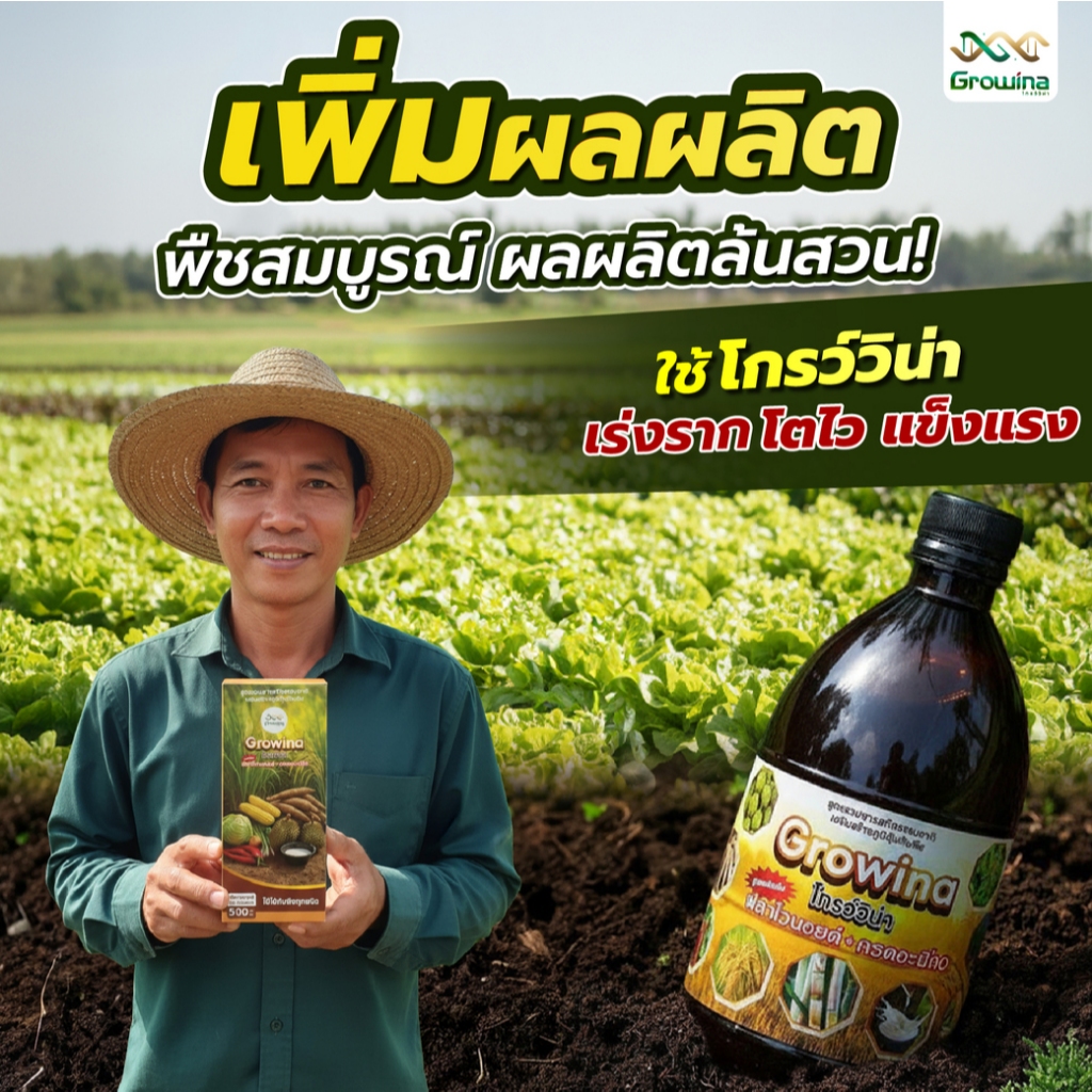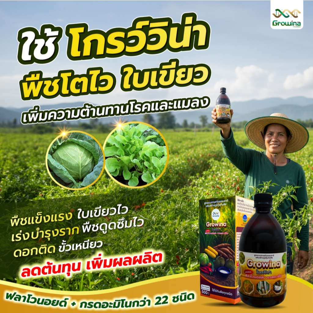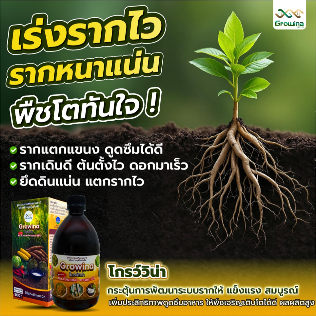 Growina โกรว์วิน่า ฮอร์โมนพืช ลดปุ๋ย ลดต้นทุน เร่งราก เร่งแตกกอ ใบเขียว ต้นใหญ่ 500 ซีซี 1 ขวด + 100 ซีซี 1 ขวด