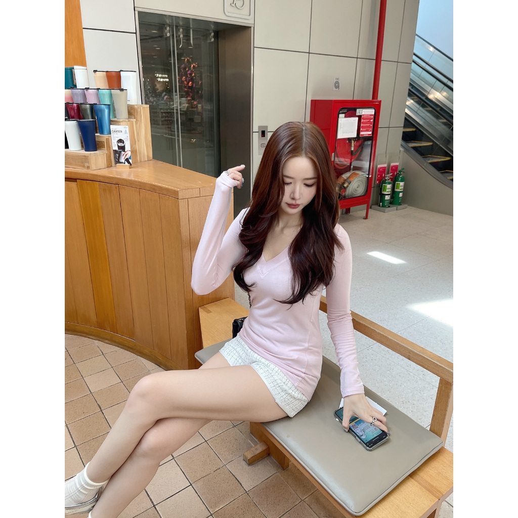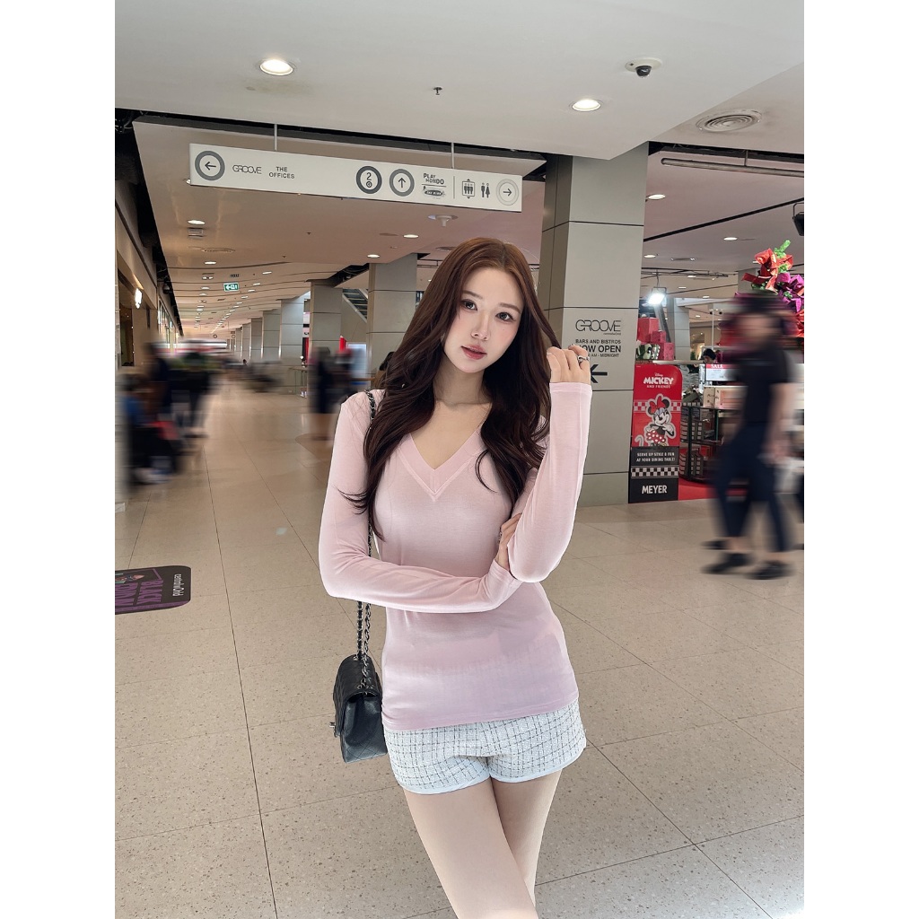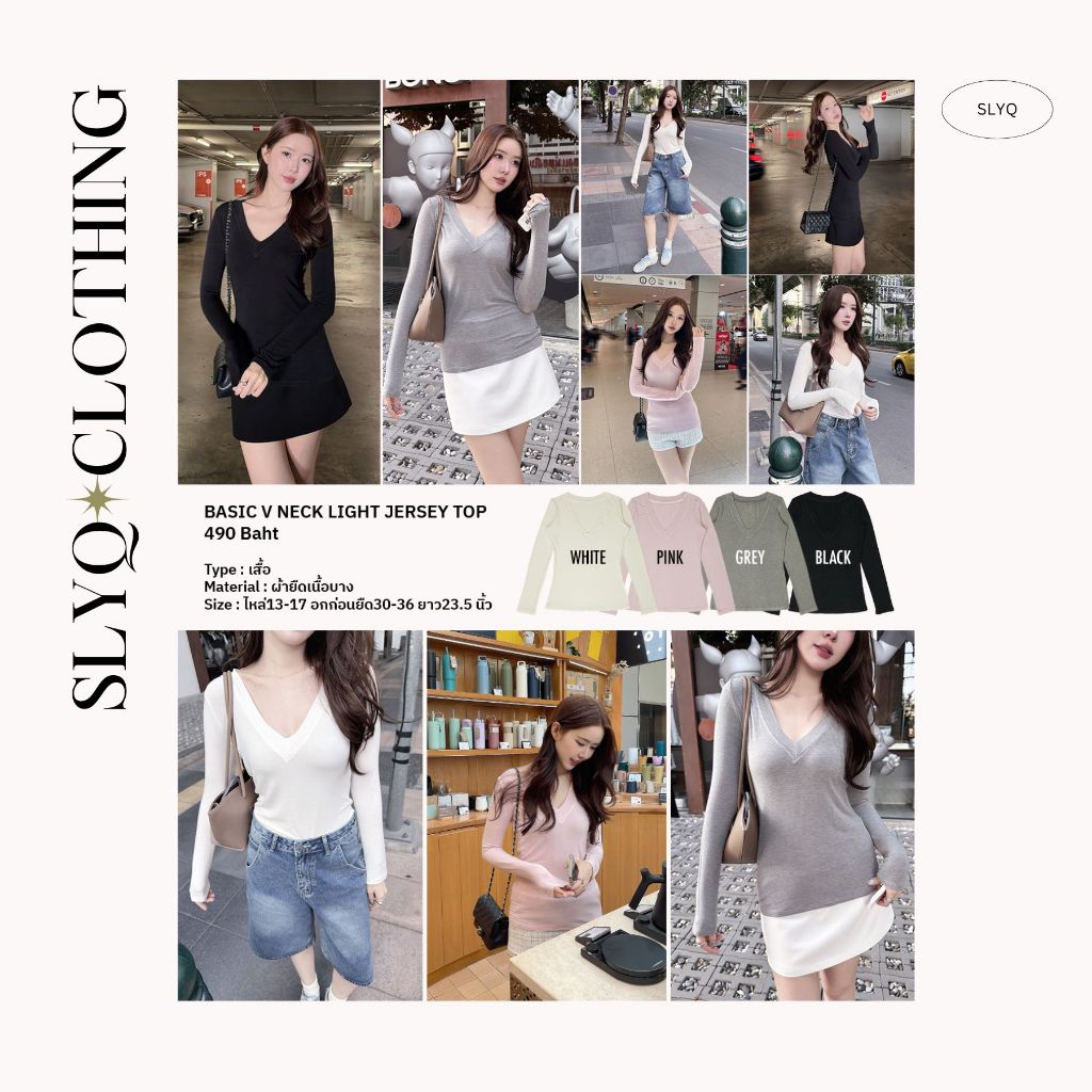 ส่งด่วน🚨 ขาว/ชมพู/เทา/ดำ SLYQ BASIC V NECK LIGHT JERSEY TOP เสื้อยืดแขนยาวคอวีผ้าบาง