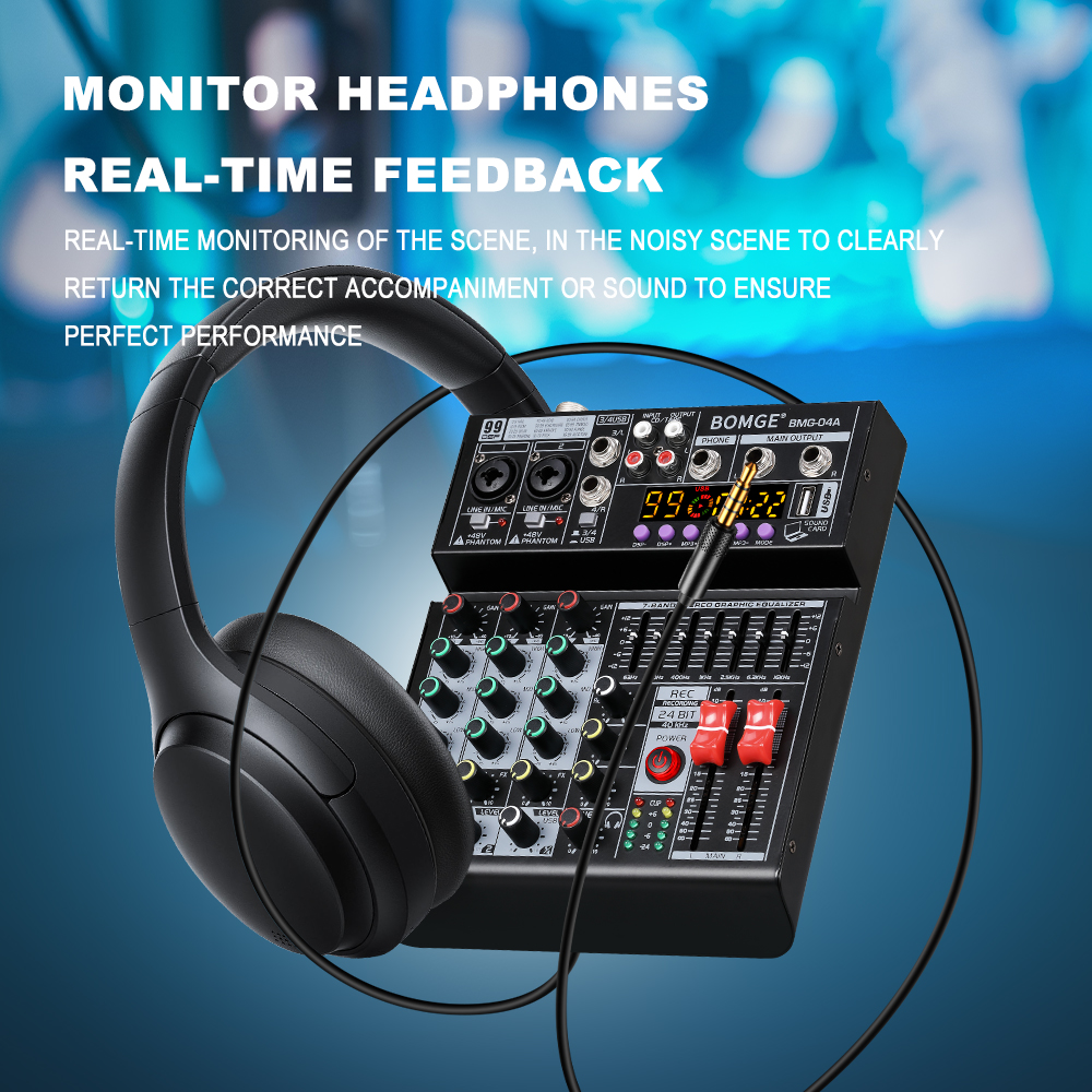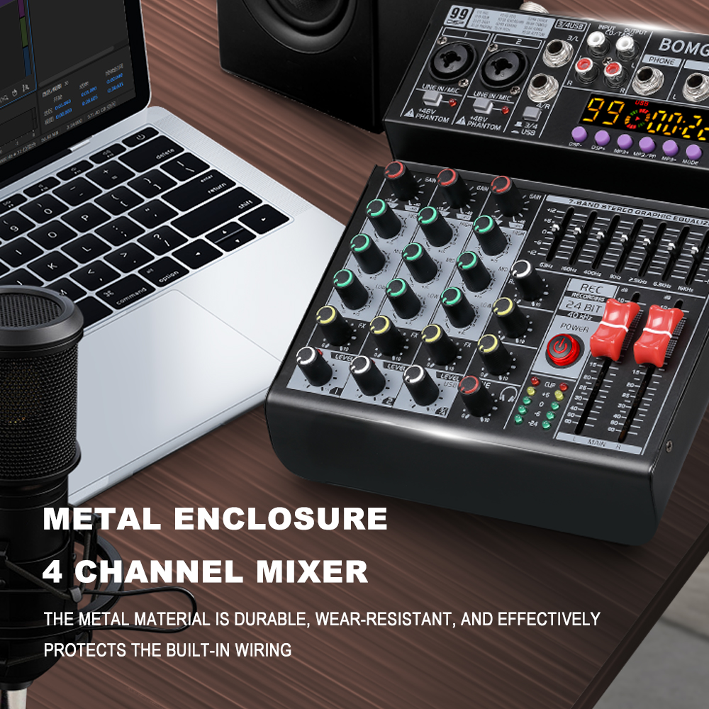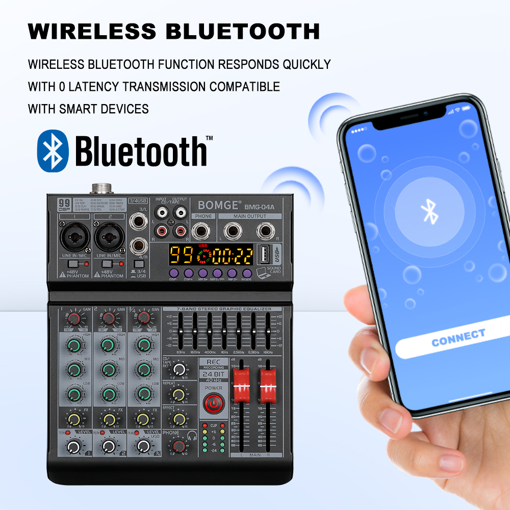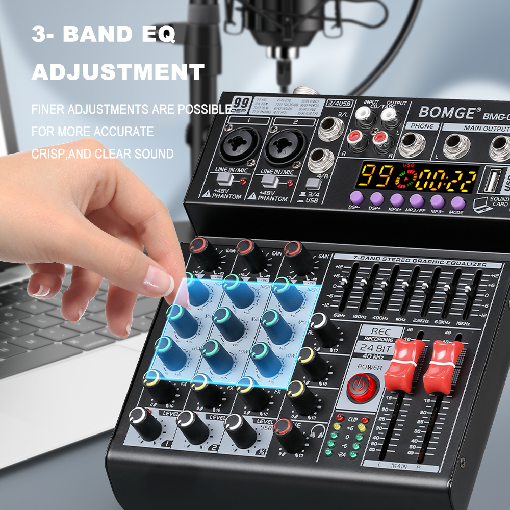 BOMGE เครื่องผสมเสียง 4/6/8 ช่อง พร้อมบลูทูธ 99 DSP, ไฟ Phantom 48V สําหรับงานพอดแคสต์และการบันทึกเสียงระดับมืออาชีพ