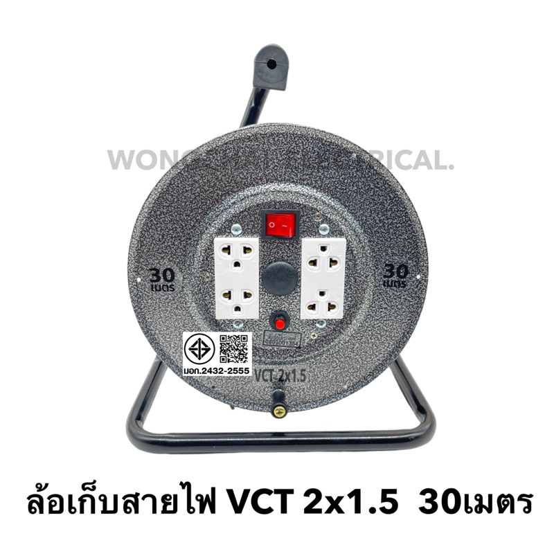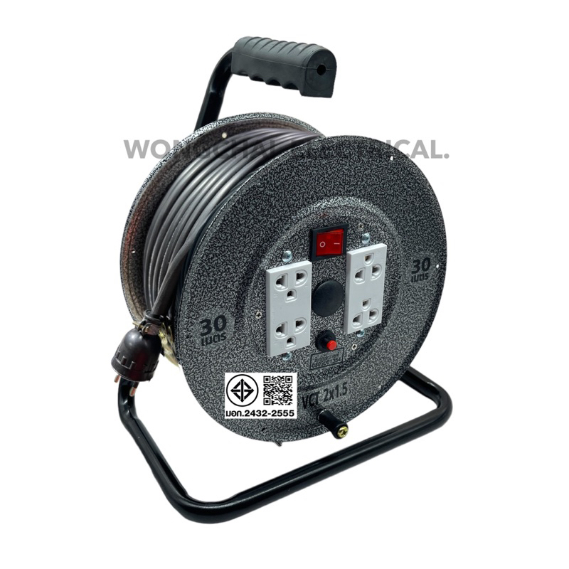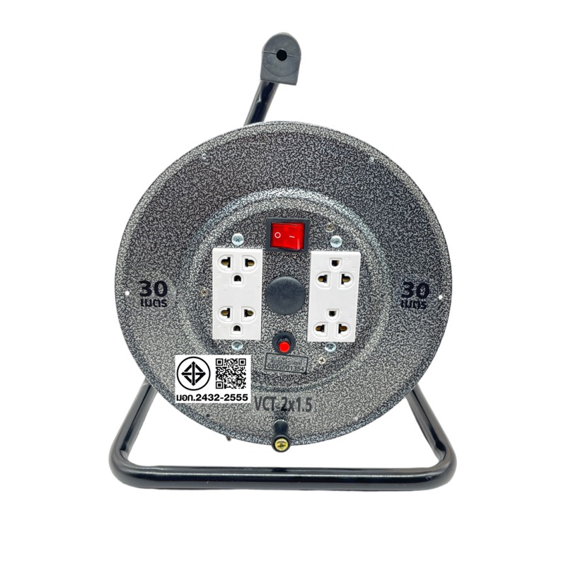 ล้อเก็บสายไฟVCT 2x1.5 Sq.mm.พร้อมสาย 30 เมตร สีดำ รุ่นมีสวิทซ์ควบคุม ปลั๊กกราวคู่ 2ตัว มีฟิวส์ตัดไฟ