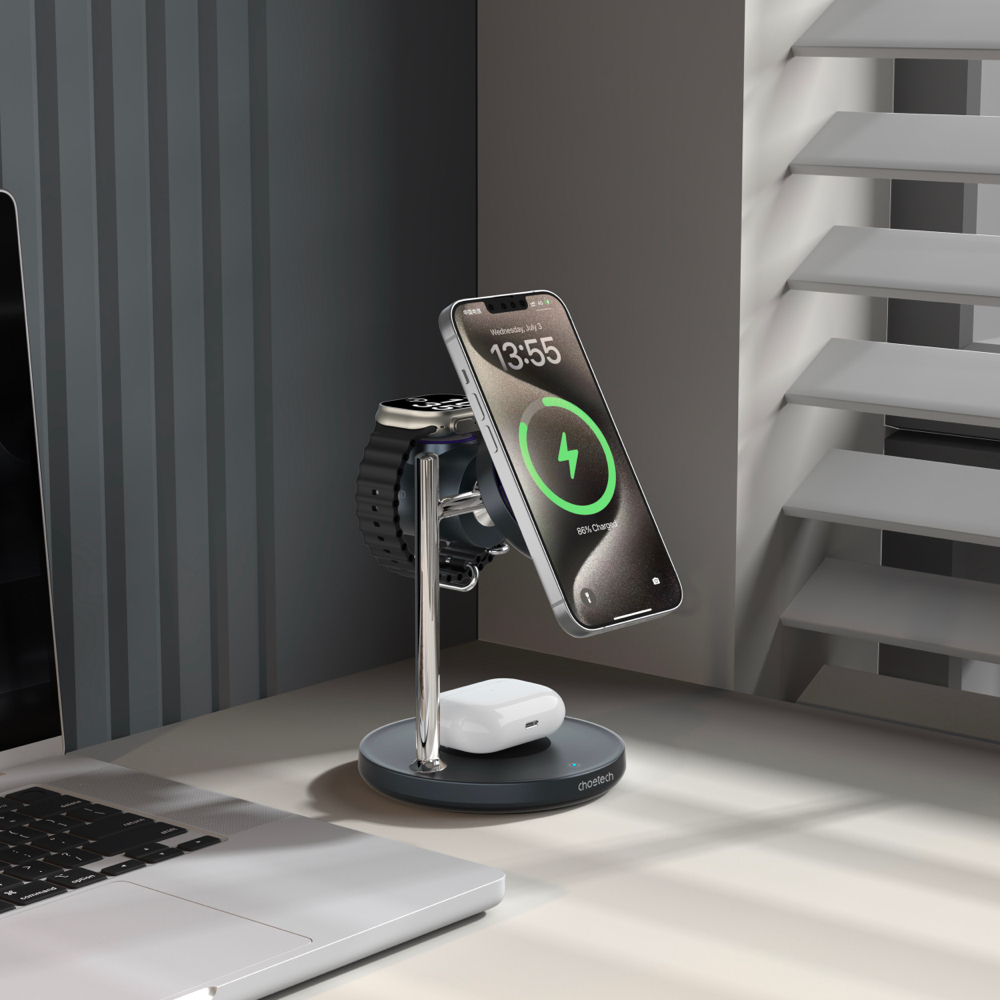 Choetech แท่นชาร์จไร้สาย 3 in 1 Stand Wireless Charger Qi2.2 25W Grey รองรับการชาร์จเร็วสูงสุด 25w