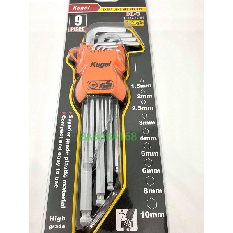 ชุดหกเหลี่ยม9ชิ้นยาว Kugel ( มิล )ประแจแอล ชุดตัวแอล ประแจหกเหลี่ยม หัวบอล (1.5mm-10 mm) ประแจแอลชุดมิล หกเหลี่ยมยาว