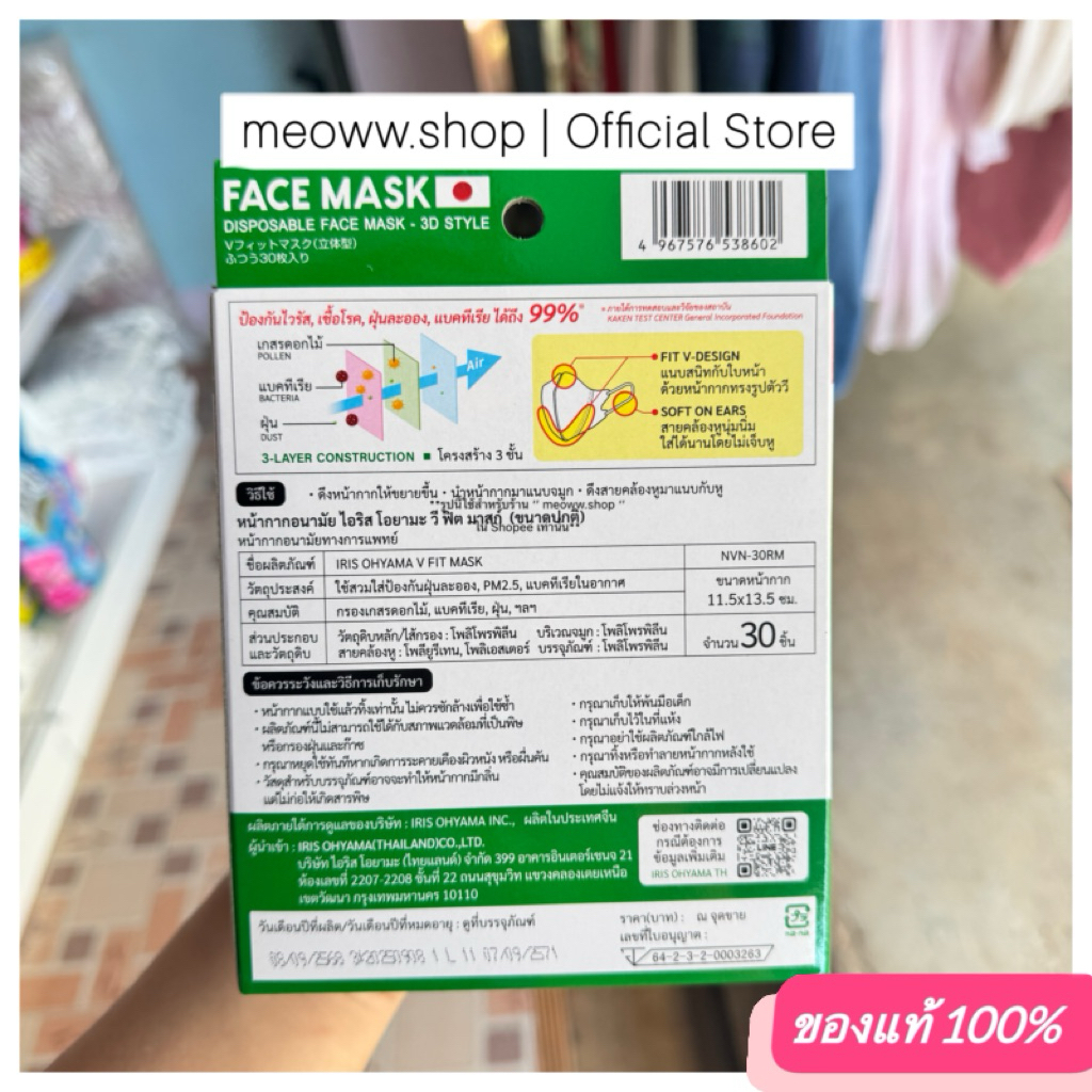 1 Pcs. [ แบบกล่อง 30 ชิ้น ] IRIS OHYAMA ไอริส โอยามะ หน้ากากอนามัย V-fit ใส่สบาย กระชับ