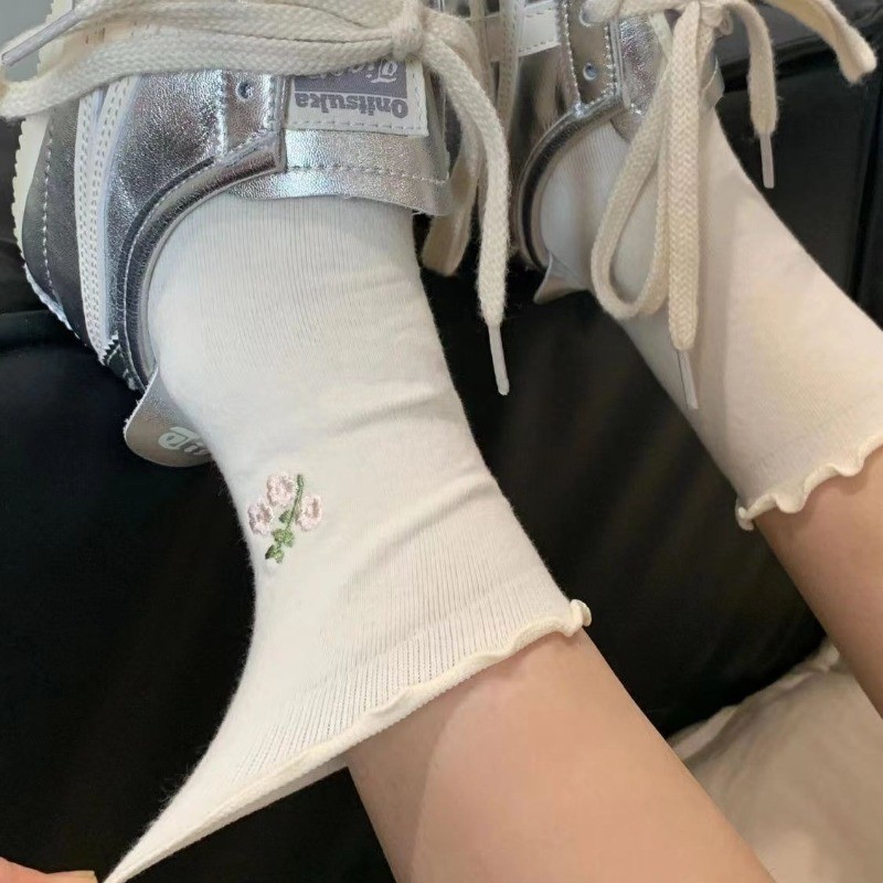 ถุงเท้าลูกวัว Q-Fun ลายดอกไม้น่ารัก สบายสำหรับผู้หญิง โทนสีทึบ