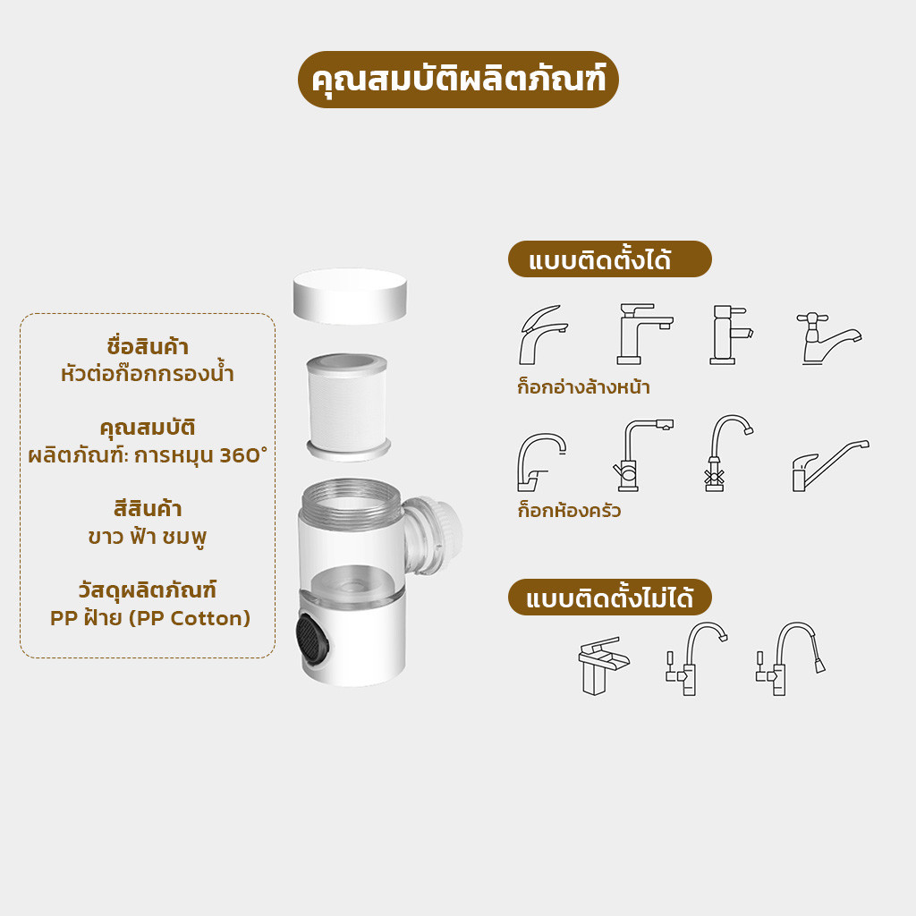 ตัวกรองก๊อกน้ำ หมุนได้ 360° วัสดุ PP Cotton ติดตั้งง่าย ไม่ต้องใช้เครื่องมือ ลดคลอรีน ลดตะกอนในน้ำปะปา