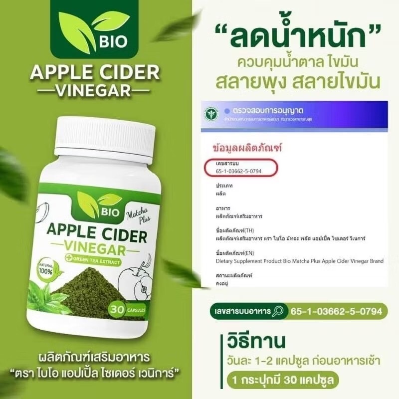วิตามินชาเขียวมัทฉะ BIO APPLE CIDER VINEGAR (1 กป. 30 แคปซูล) ของแท้100%