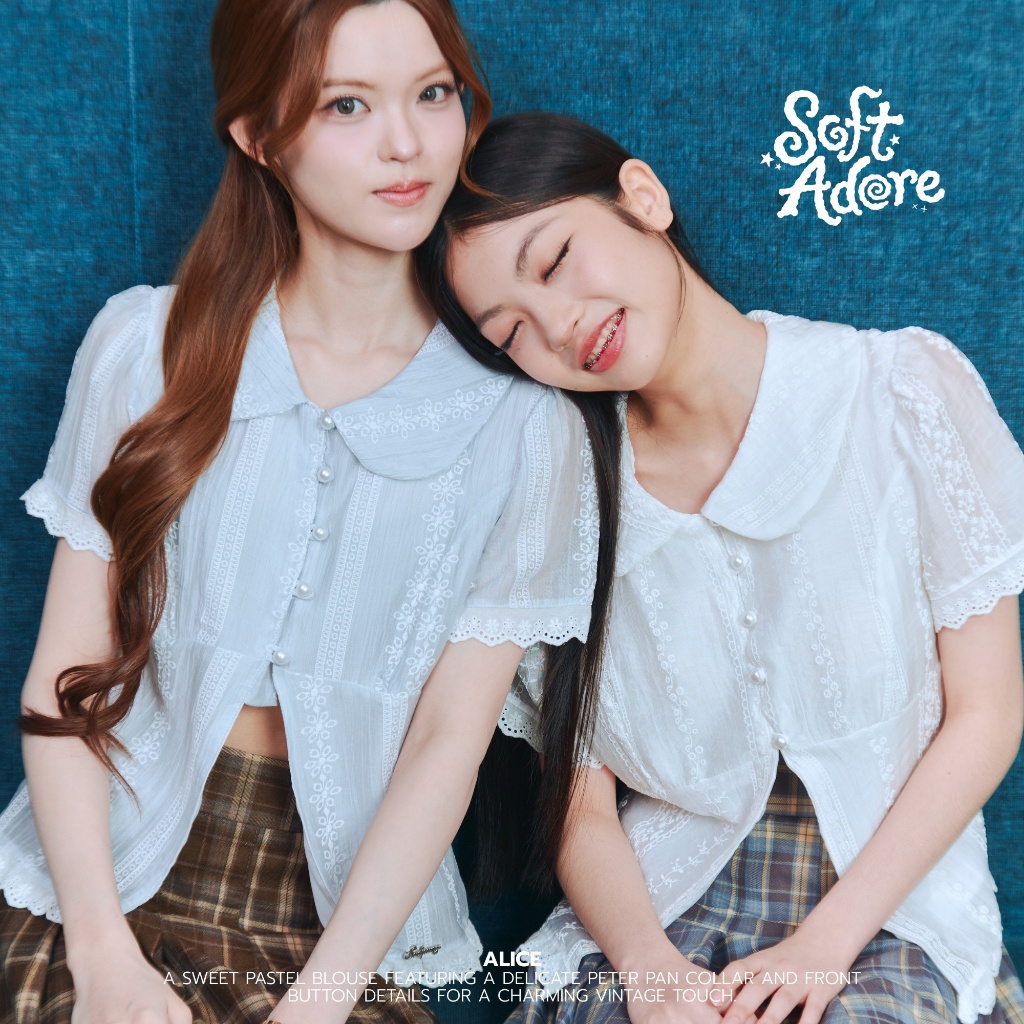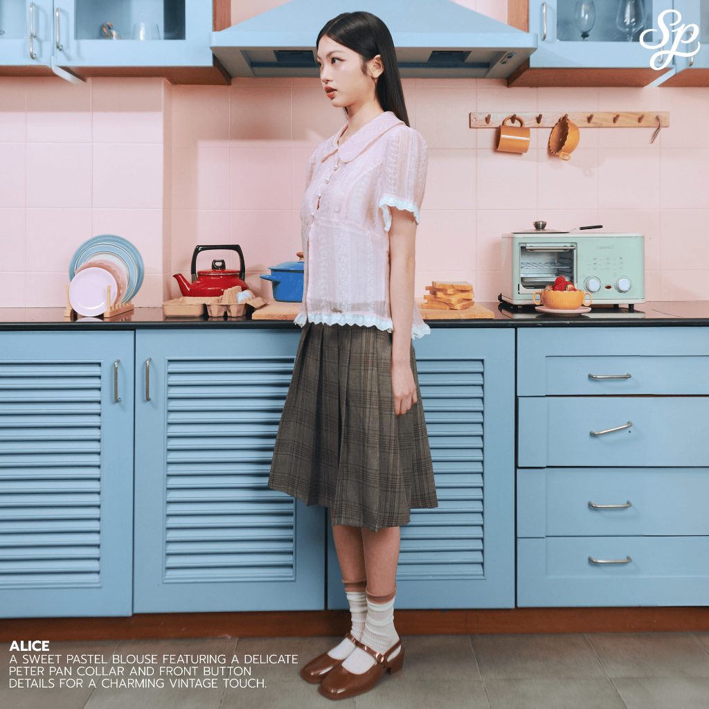 ALICE_SP120 เสื้อคอบัวลูกไม้ แหวกหน้ากระดุมมุก ผ้าซีทรูมีซับ สไตล์เกาหลีหวานละมุน