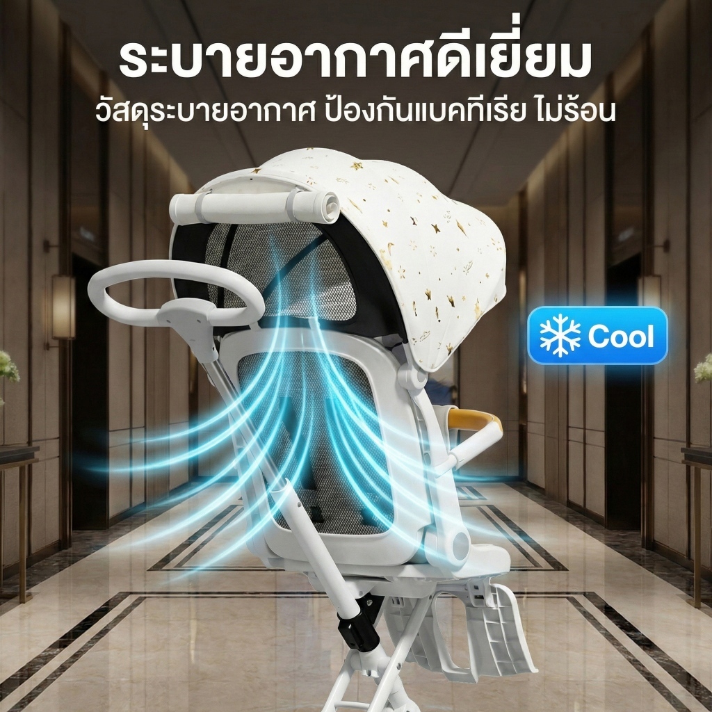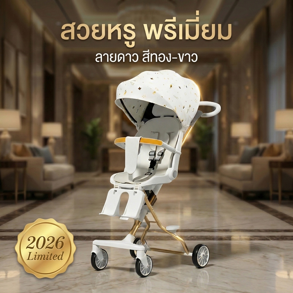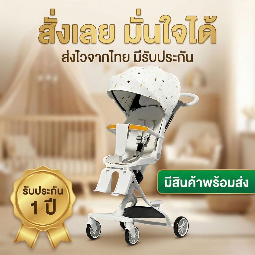 Beige รถเข็นเด็ก หมุนที่นั่งได้ 360 ° (นั่ง/เอน/นอน) มีจานอาหาร รถเข็นเด็กพับได้ 0-5 ปี