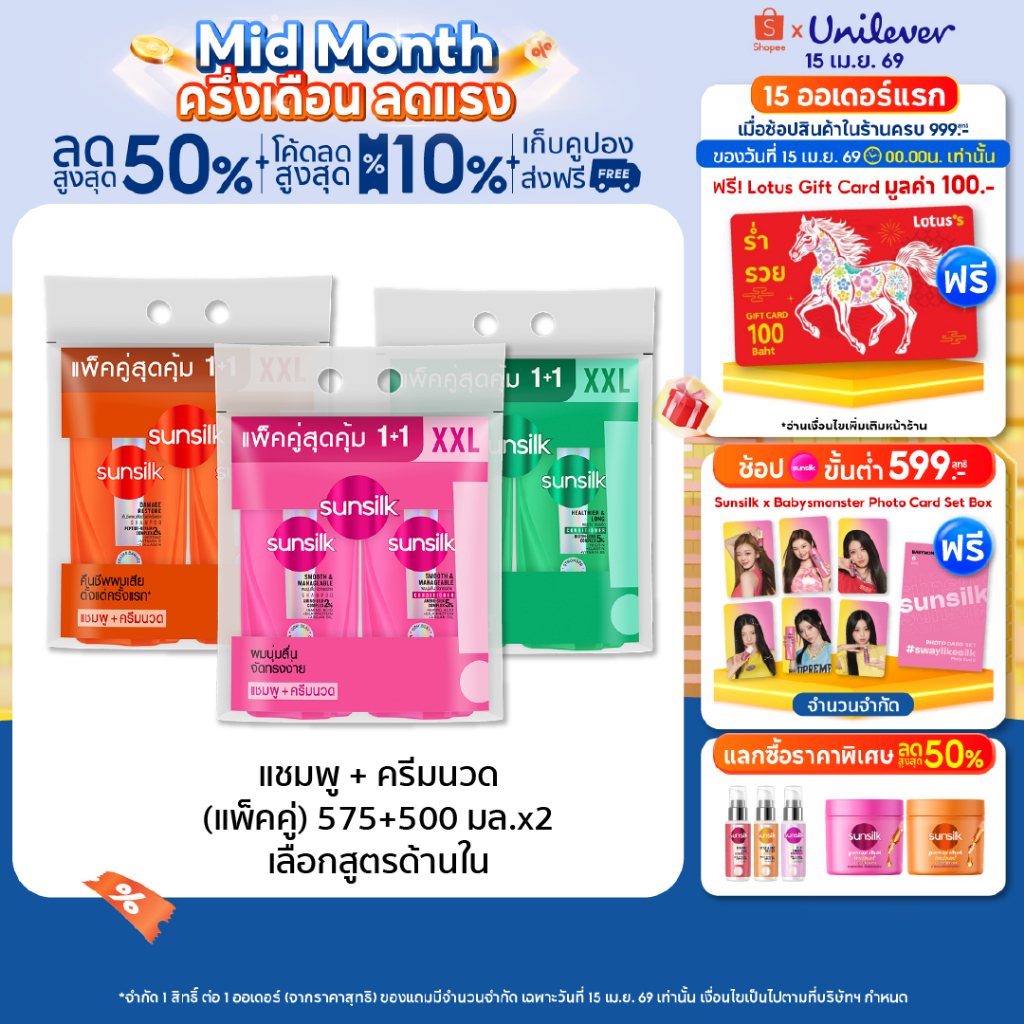 [ซื้อ1แถม1] ซันซิล แชมพู+คอนดิชันเนอร์ 575มล+550 มล x1 (เลือกสูตรด้านใน)