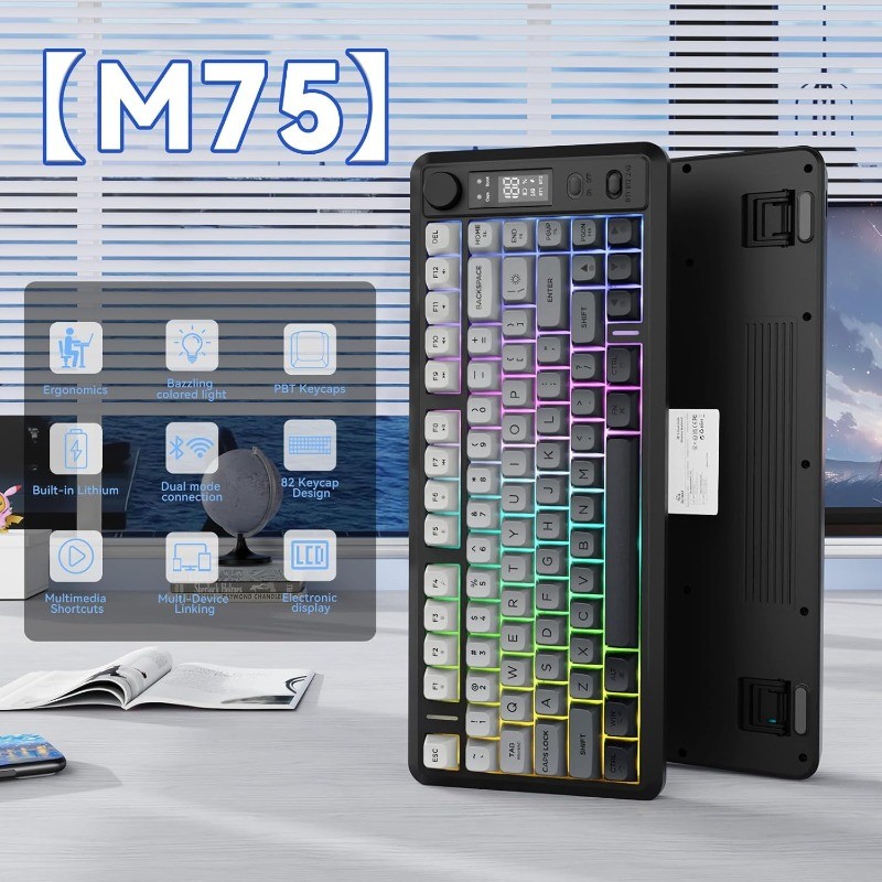 FREEWOLF M75 คีย์บอร์ดเกมไร้สาย RGB Backlit ชาร์จ 2000mAh แบตเตอรี่เมมเบรนสมาร์ทจอแสดงผลและลูกบิด PBT Gradient Keycaps สําหรับ PC/MAC