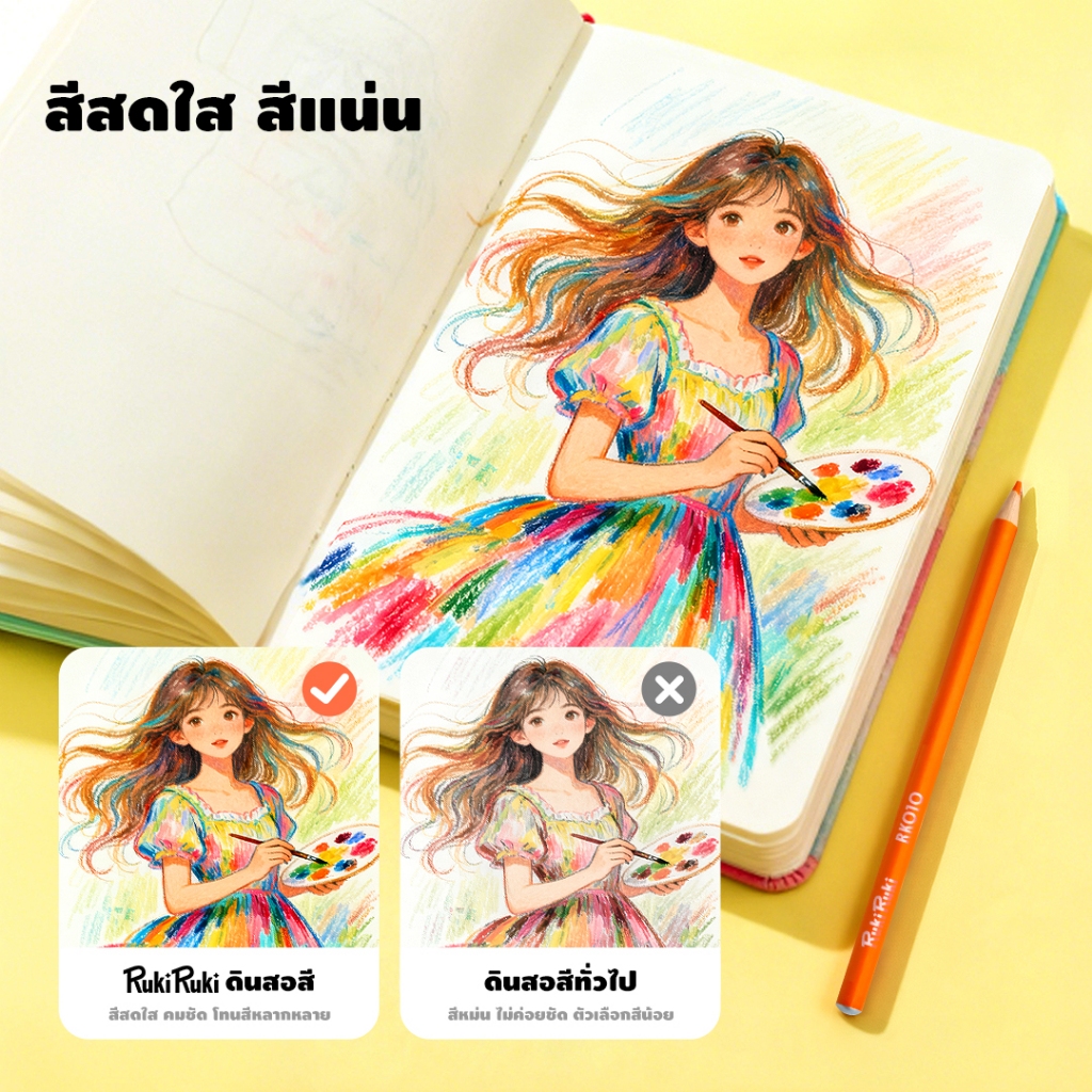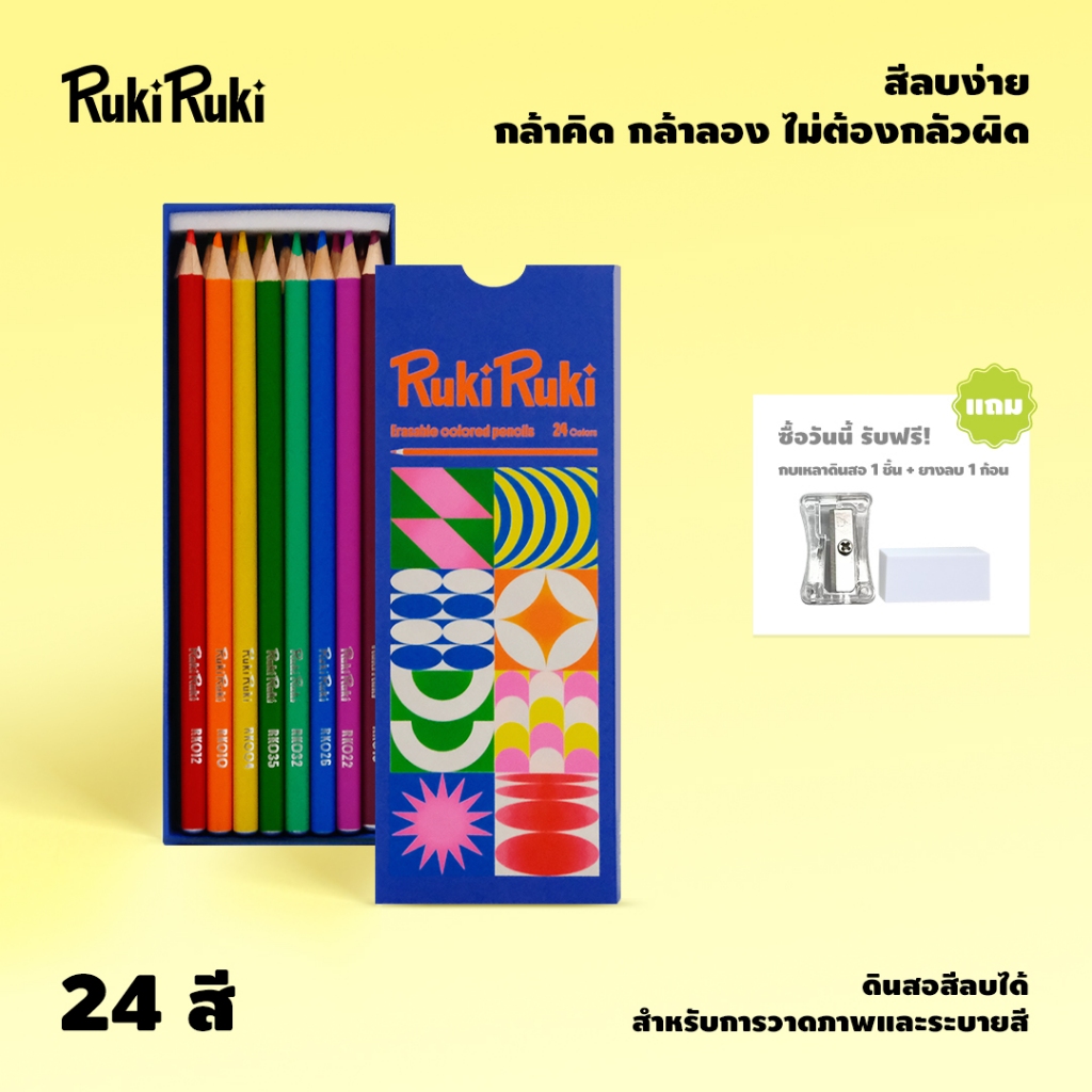 RukiRuki ดินสอสีลบได้ 24/48 สี, สีสันสดใส, ลบสะอาด! แกนเรียบ 3.0 มม. ปลอดภัยและปลอดสารพิษ ยางลบ+กบเหลาฟรี ของแท้ พร้อมส่ง (เทรนด์!)