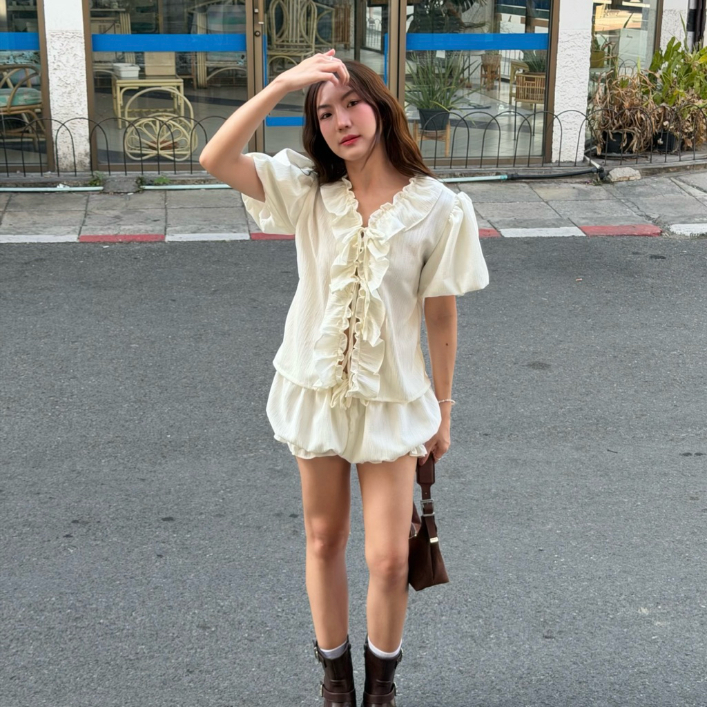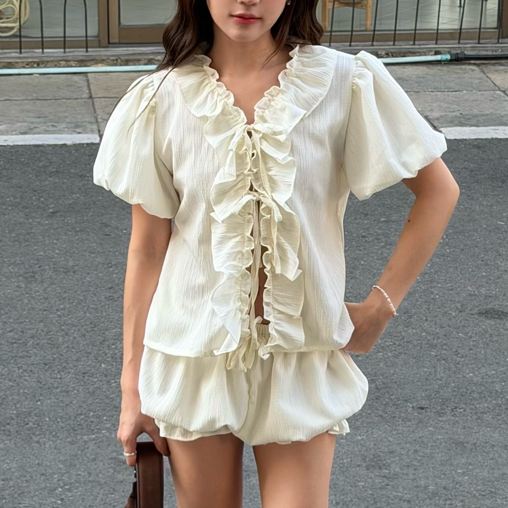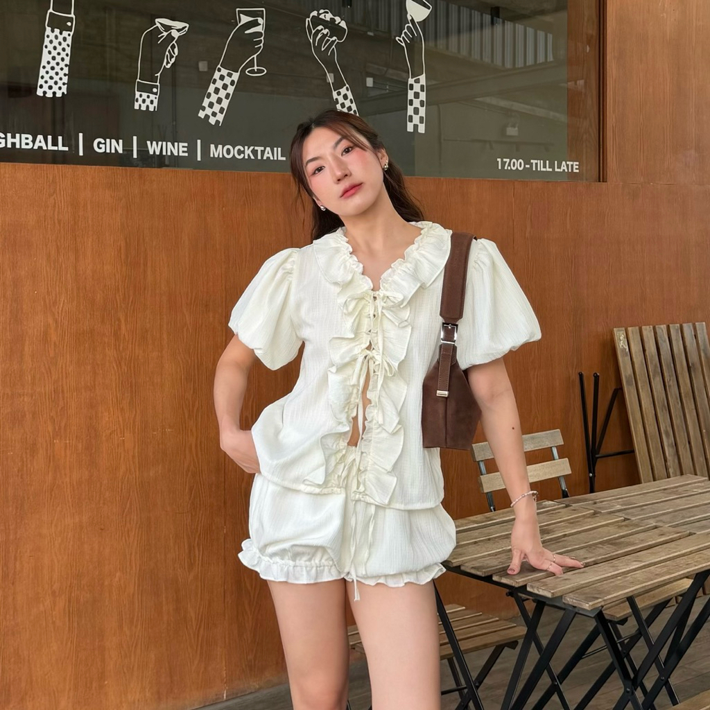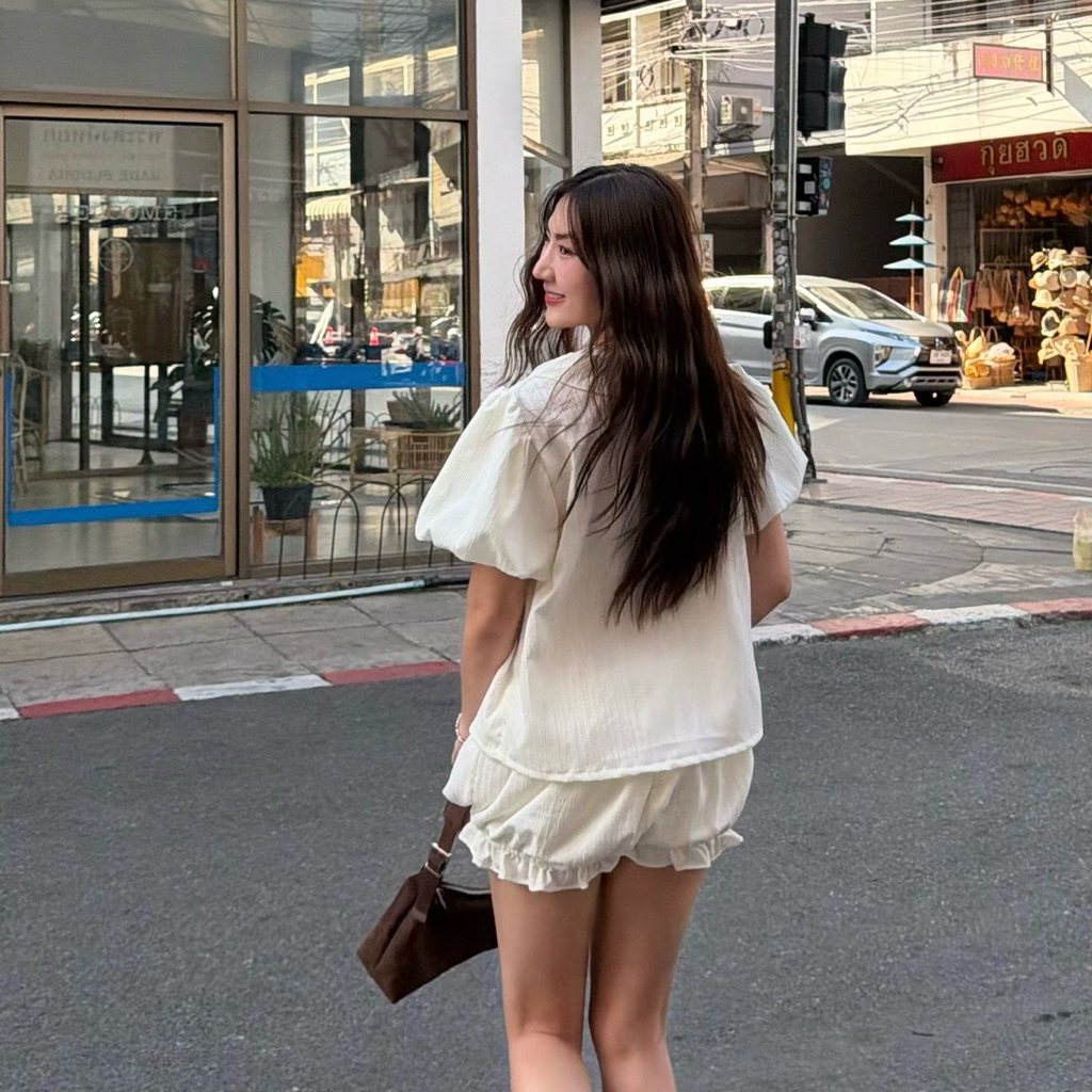 𝙎𝙪𝙣𝙨𝙝𝙞𝙣𝙚 𝙨𝙚𝙩✨☀️ชุดเซตผ้าดับบี้แขนพองแบบสั้นแต่งระบายขอบเสื้อน่ารักเหมาะกับหน้าร้อนแบบนี้ มาคู่กับกางเกงขาสั้นแบบพอง