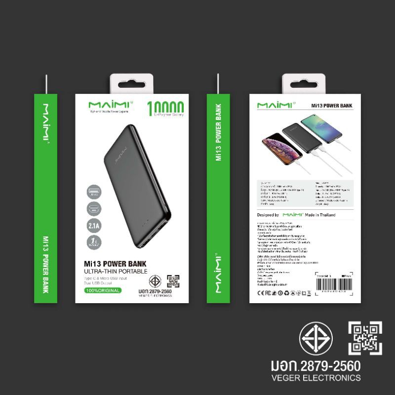 Powerbank แบตสำรอง ยี่ห้อ Maimi รุ่น Mi13 มี มอก 10000mah แบตสำรองมี มอก. มีรับประกัน1ปี