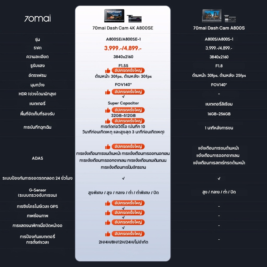 [NEW]70mai Dash Cam 4K A800SE Dual-Vision 30 FPS Car Camera RC22 wifi กล้องติดรถยนต์ ควบคุมผ่าน APP รับประกันศูนย์ไทย1ปี