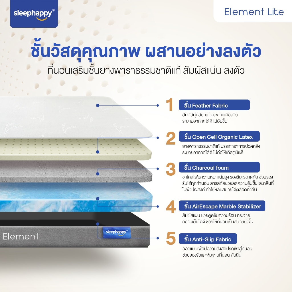 SleepHappy ที่นอนยางพาราแท้ รุ่น Element Lite หนา 6 นิ้ว ที่นอนเพื่อสุขภาพ สัมผัสแน่นไม่ปวดหลัง ระบายอากาศดี