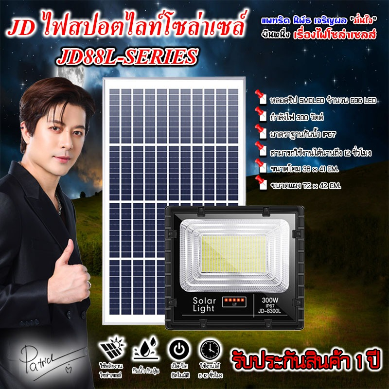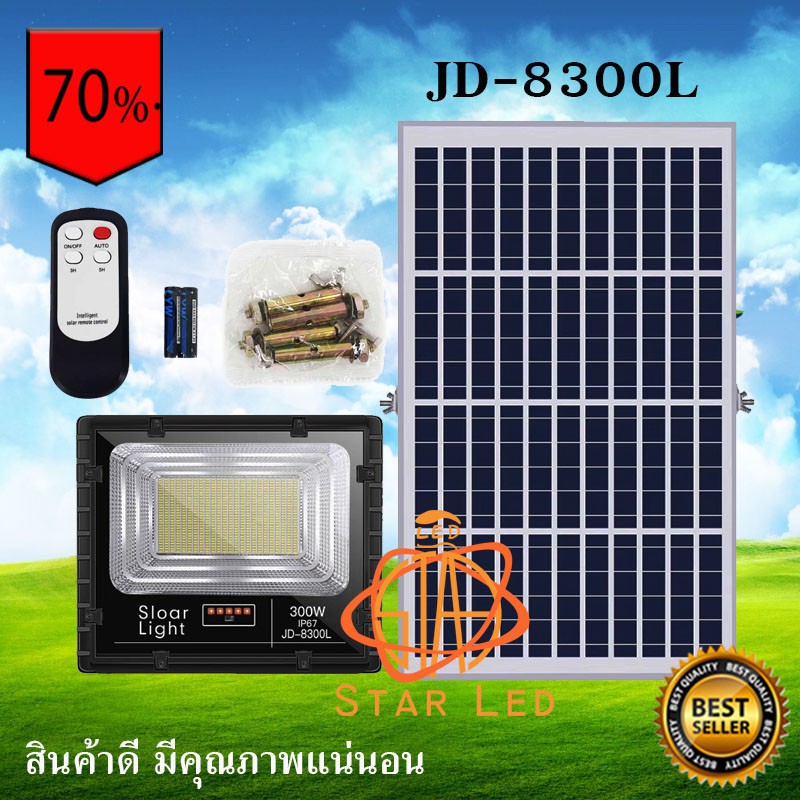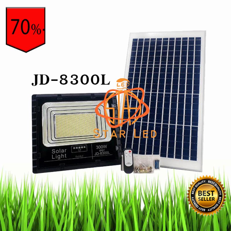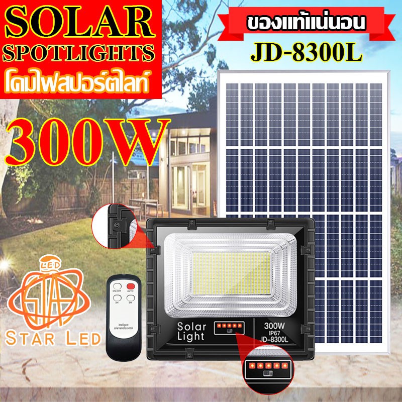ไฟโซล่าเซลล์ Solar LED สปอตไลท์ โซล่าเซลล์ รุ่น JD-8300L-WW 300W*แสงวอมไวท์*WW เปลี่ยนแบตเตอรี่ได้