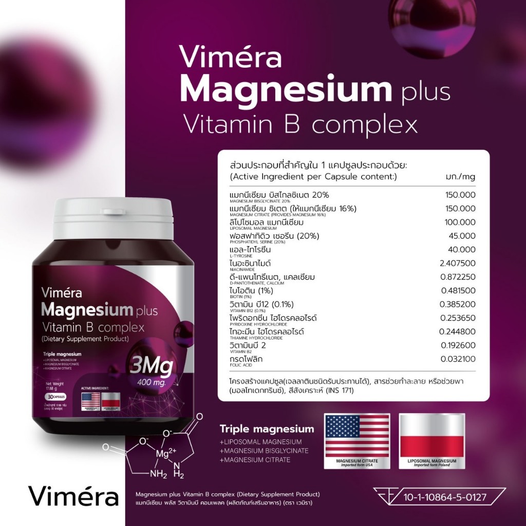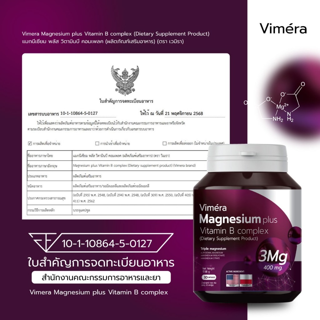 Vimera Magnesium plus Vitamin B complex แมกนีเซียม วิตามินบี คอมเพล็กซ์การนอน ไมเกรน ตะคริว มือเท่าชา