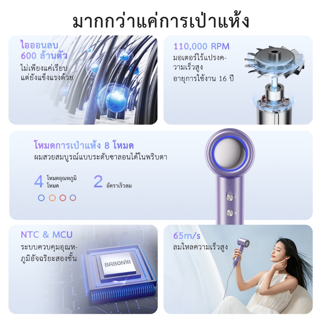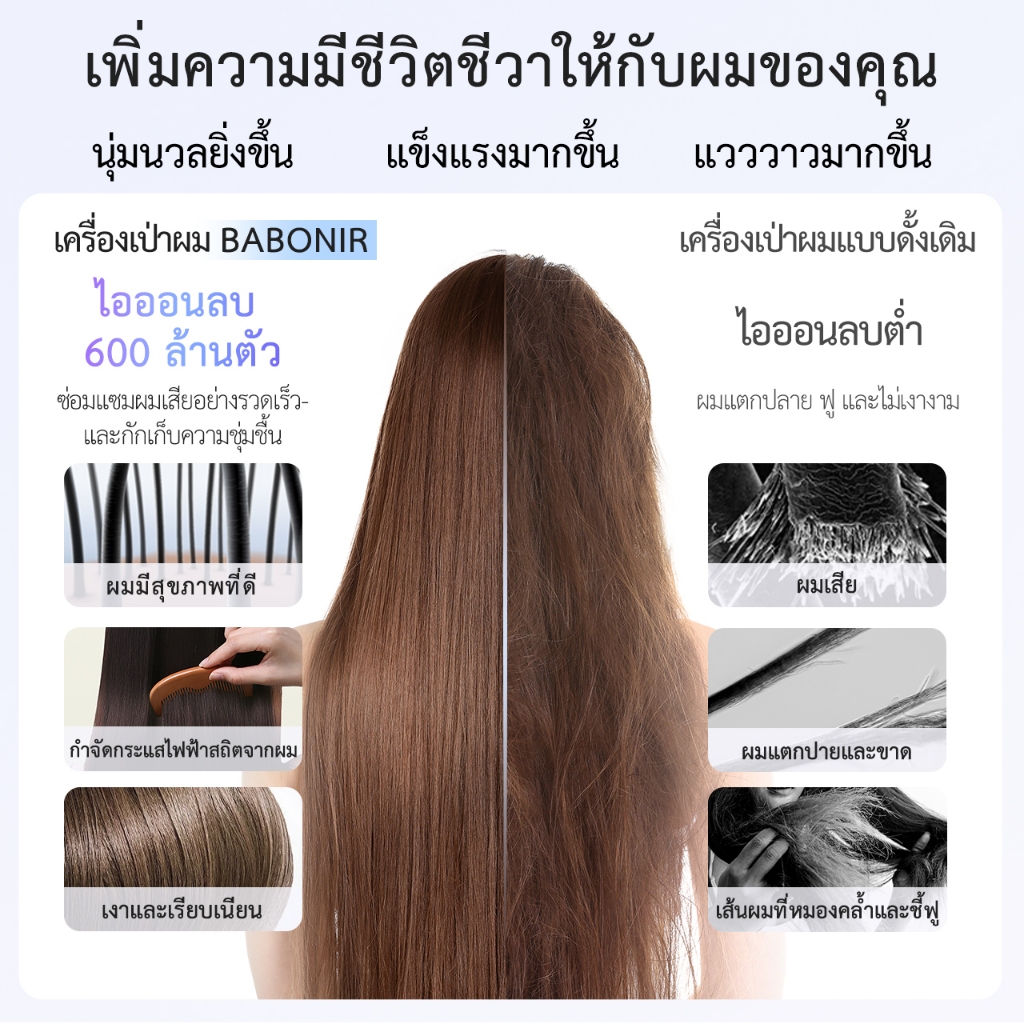 Babonir ไดร์เป่าผมความเร็วสูง มาพร้อมไอออนลบ 600 ล้านตัว ดูแลผมด้วยอุณหภูมิคงที่ รับประกัน 1 ปี Songkran