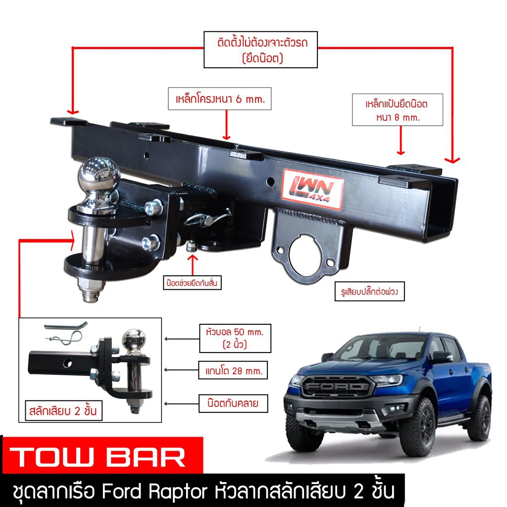 ชุดลากเรือ ลากพ่วง Ford Raptor 2018-2021 สลักเสียบ 2 ชั้น หางลาหเรือ โทว์บาร์ TB-001 Tow Bar LWN4x4