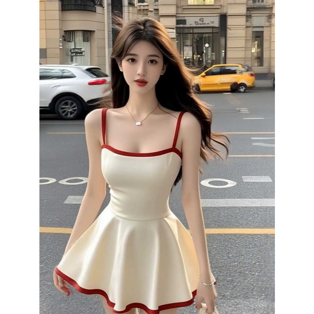 🫧Beautified🫧มินิเดรสสีครีม สายเดี่ยว ดีไซน์แต่งขอบและชายผ้าสีแดง กระโปรงทรงเอ ผ้าสเปนเด็กซ์ ไม่ยับ S-XL👗11004