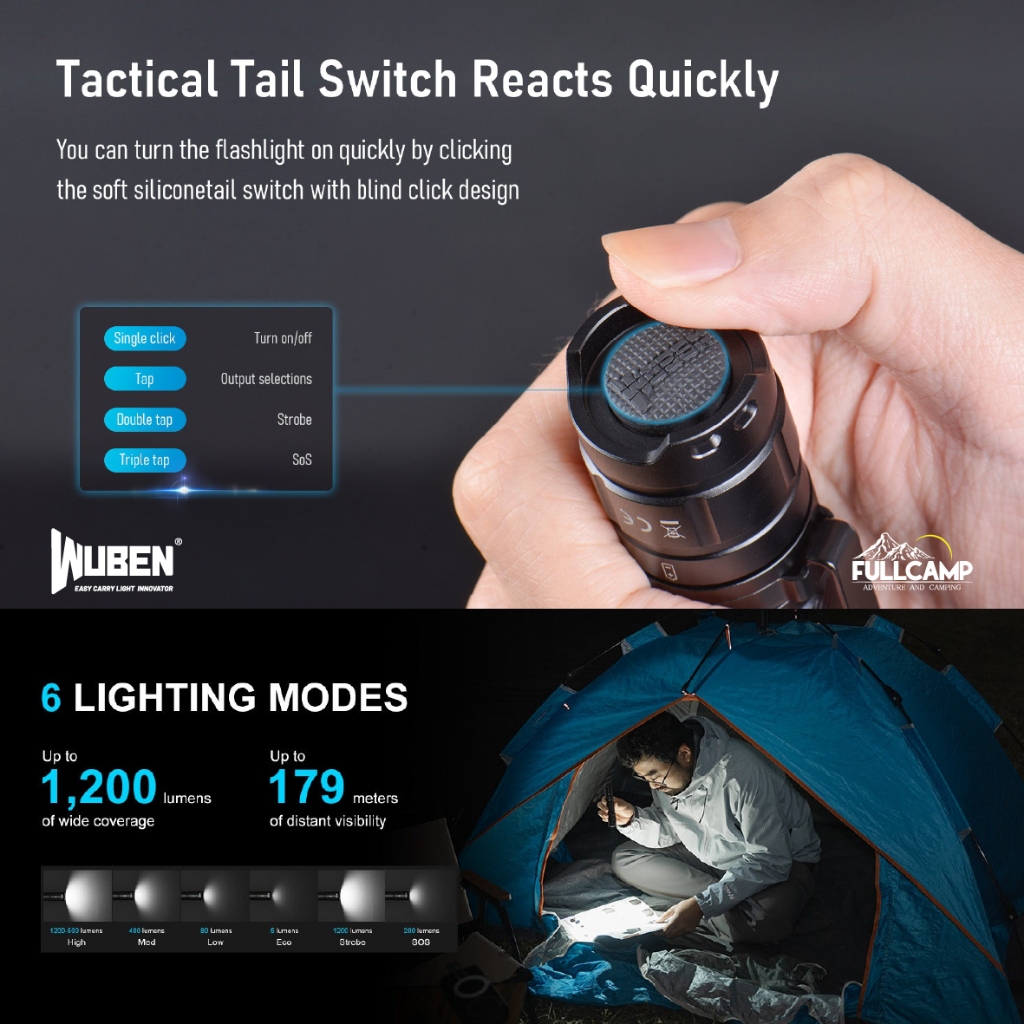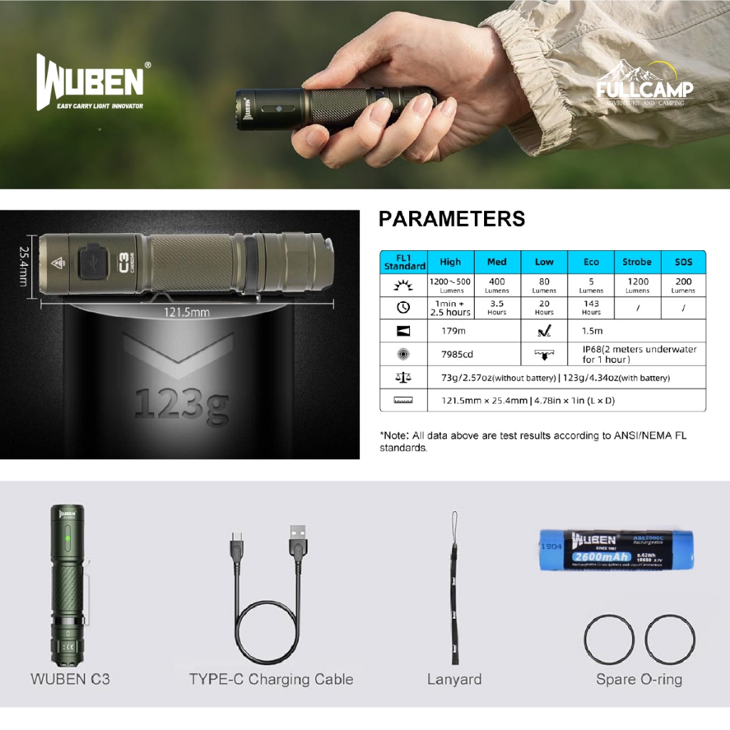 Wuben C3 ไฟฉาย LED Type-C แบบชาร์จไฟ สว่างสูงสุด 1200 ลูเมนส์ ไฟฉายพกพา ไฟแคมป์ปิ้ง