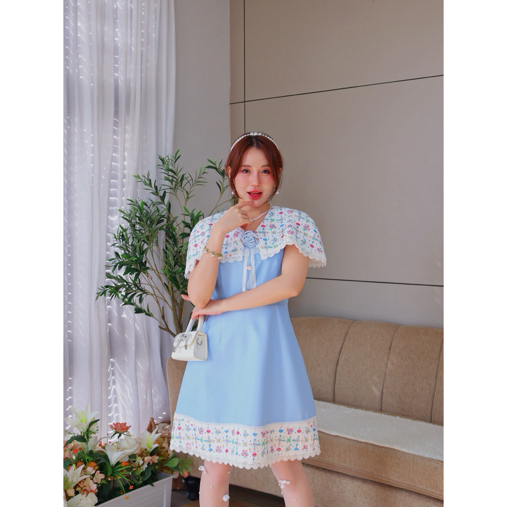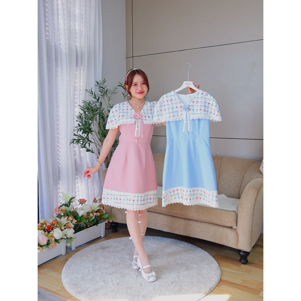 DW298 Elegance Girl Dress ชุดเดรสสวยหวาน ดีไซน์ปกผ้าคลุมบ่า ลายออกแบบจากวิร่าห์