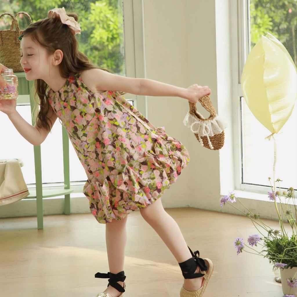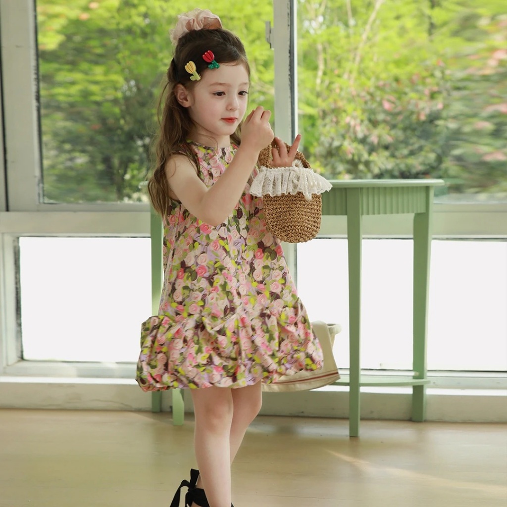 AY201 เดรสเด็กผู้หญิงลายดอกชมพู สไตล์คุณหนู เดรสเด็กพิมพ์ลายดอกไม้ โทนพาสเทล ใส่สบาย
