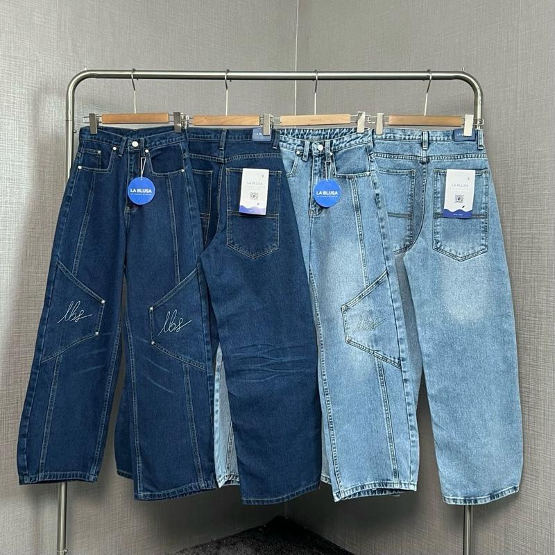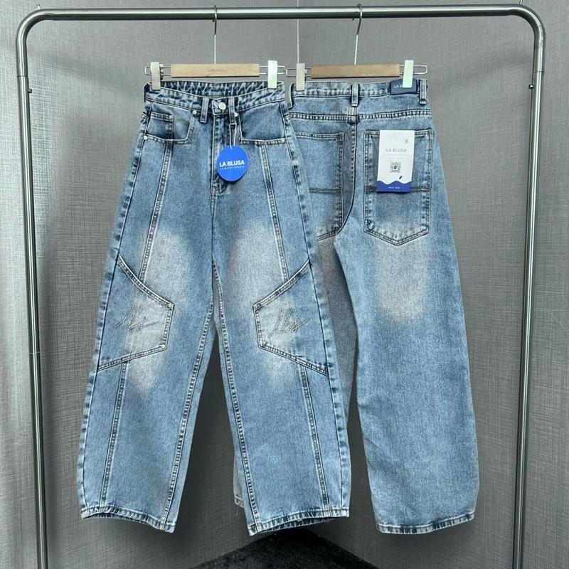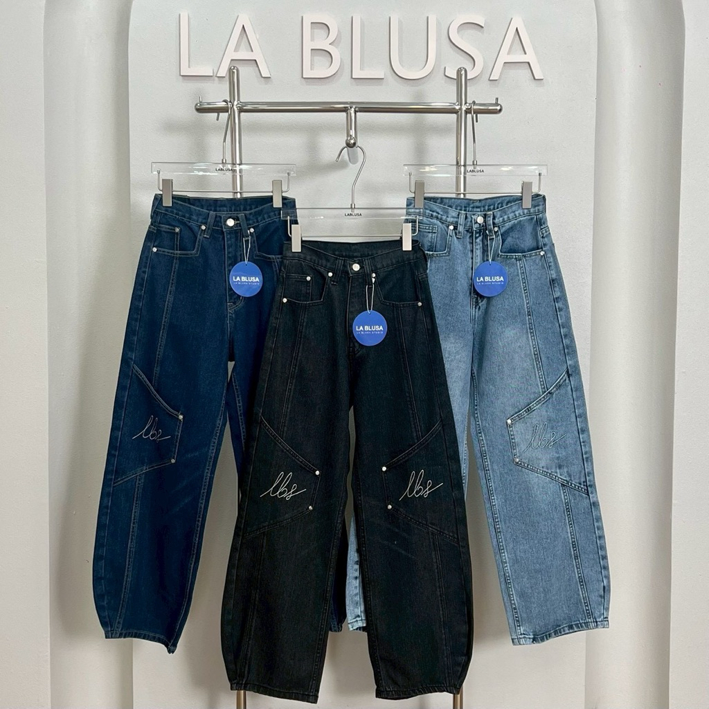 LABLUSA - LBS360 : กางเกงยีนส์ทรงบาร์เรลแต่งตะเข็บกระเป๋าเปลี่ยมปัก ปลายขาเก็บมุม ดีไซน์เท่ใส่ได้ทั้งชายและหญิง