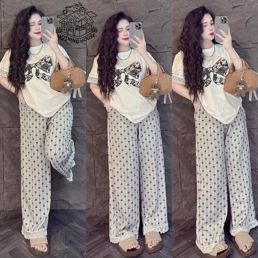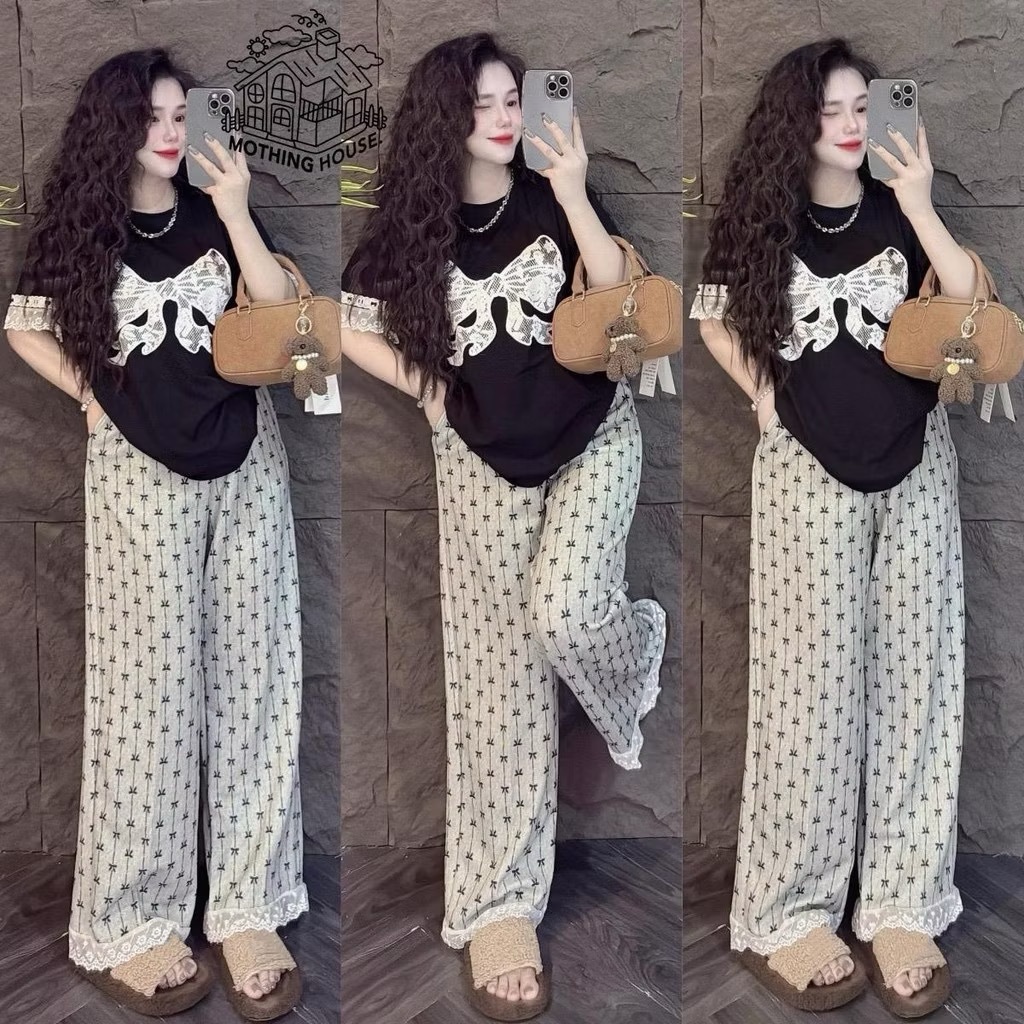 SGH0269 ชุดเซ็ตโบว์ลูกไม้หวานละมุน กางเกงขายาวเอวยางยืด เซ็ตเสื้อโบว์ลูกไม้ + กางเกงทรงหลวม