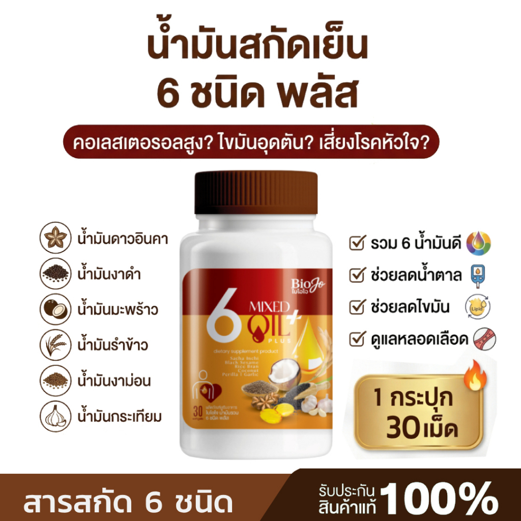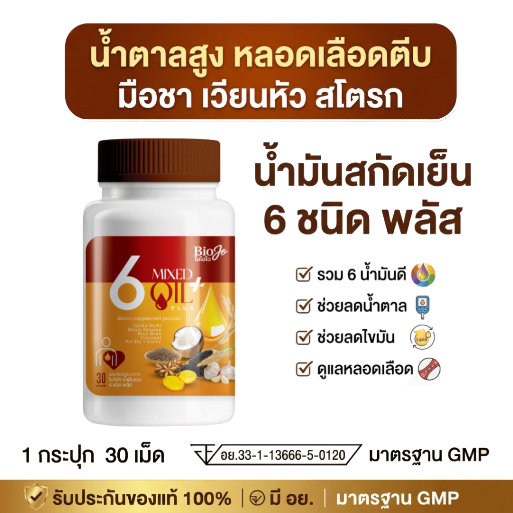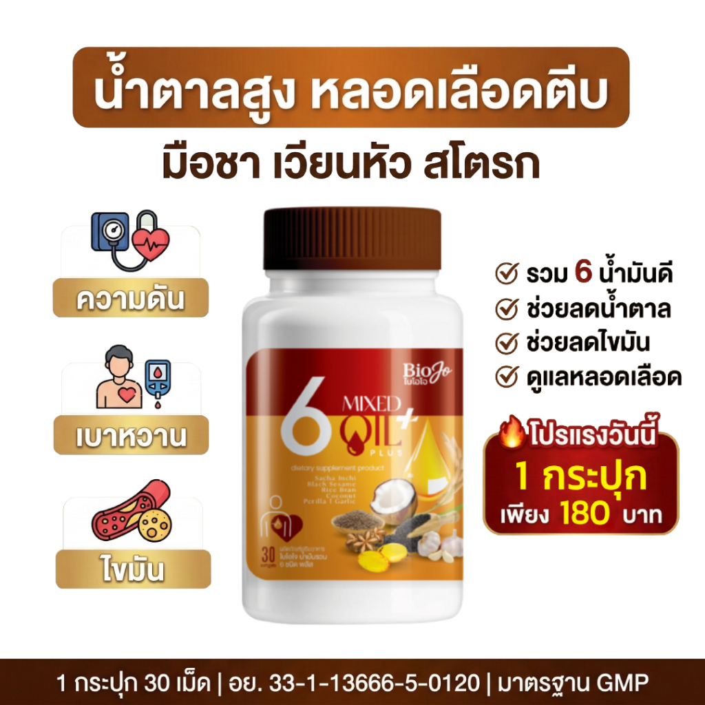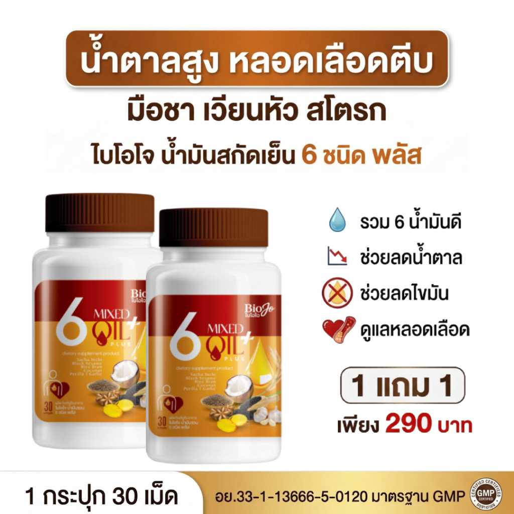 BIOJO น้ำมันสกัดรวม 6 ชนิด ลดระดับน้ำตาล ไขมัน ความดัน {1 แถม 1} 60 เม็ด ทานวันละ 1-2 เม็ด