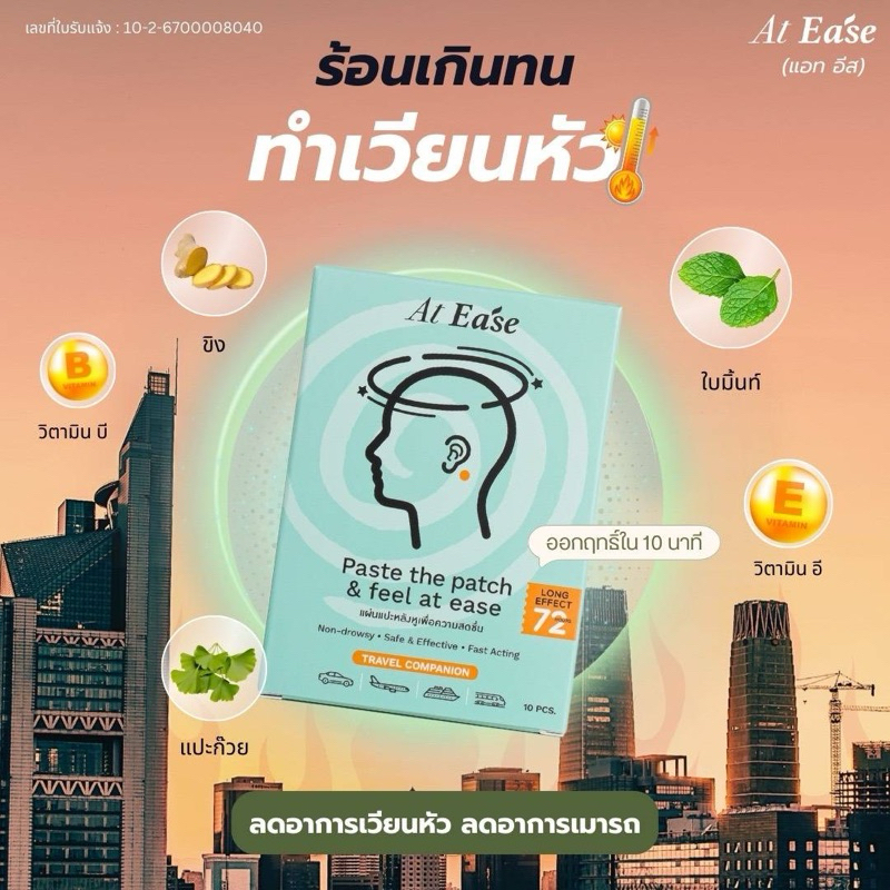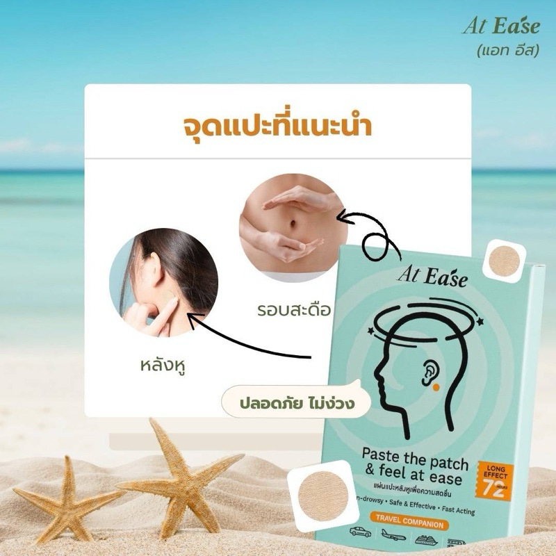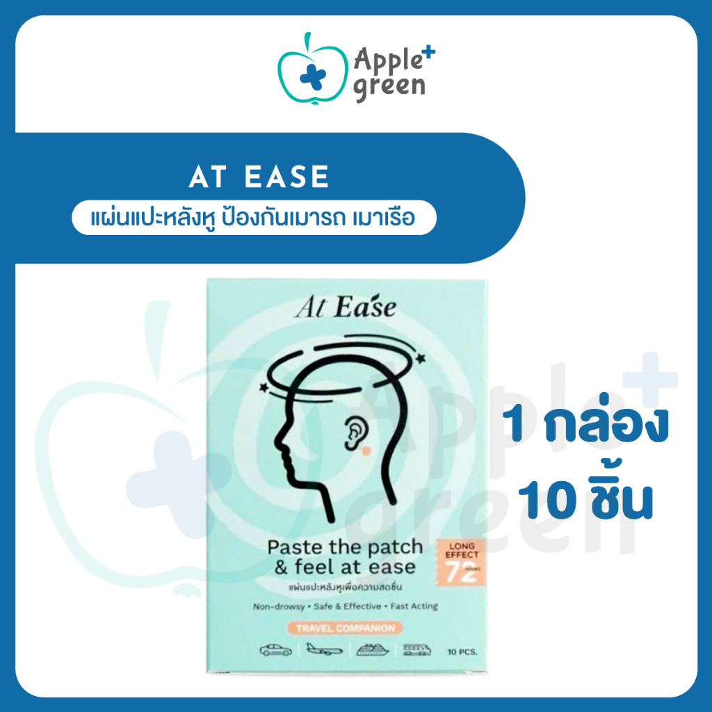 แผ่นแปะหลังหู At ease (1 กล่องมี 10 ชิ้น) ป้องกันเมารถ เมาเรือ เมาเครื่องบิน แก้วิงเวียน เวียนหัว