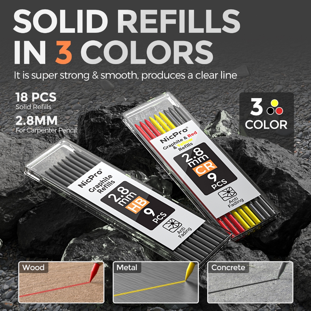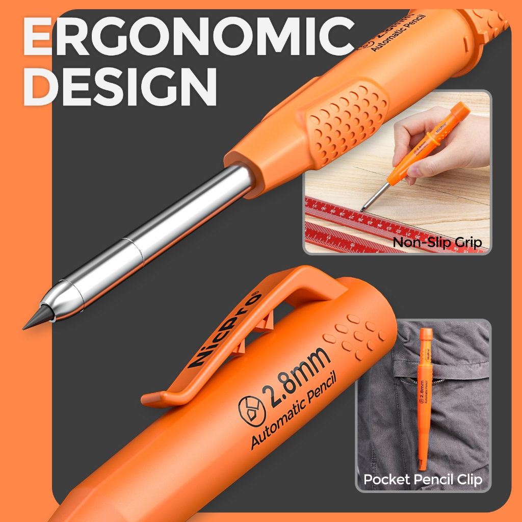 นิคโปร ซีพี3000 ดินสอช่างไม้พร้อมกบเหลา,ดินสอกด 2.8 มม.พร้อมไส้ 19 อัน,เครื่องหมายรูลึกสําหรับก่อสร้าง,ดินสองานไม้สําหรับงานหนัก,เครื่องมือช่างไม้(4สี)