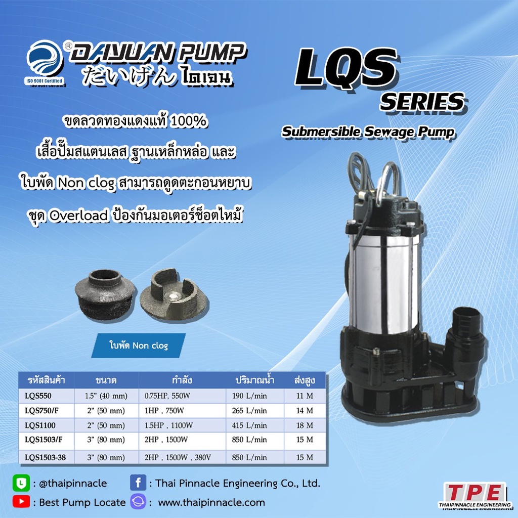 ปั้มจุ่มสแตนเลส ไดโว่ ดูดโครน ใบพัดหนาทนทาน มีลูกลอย DAYUAN รุ่น LQS/F (750w/2นิ้ว , 1500w/3นิ้ว)