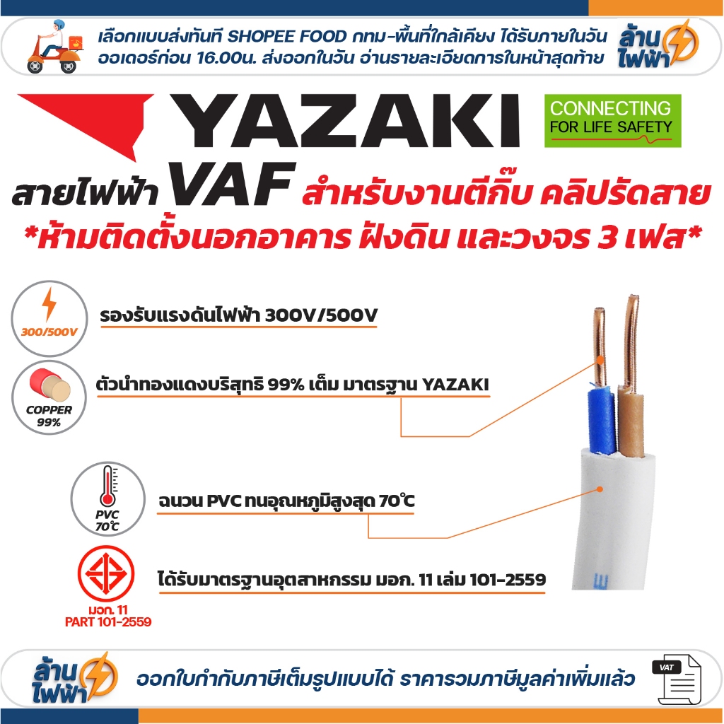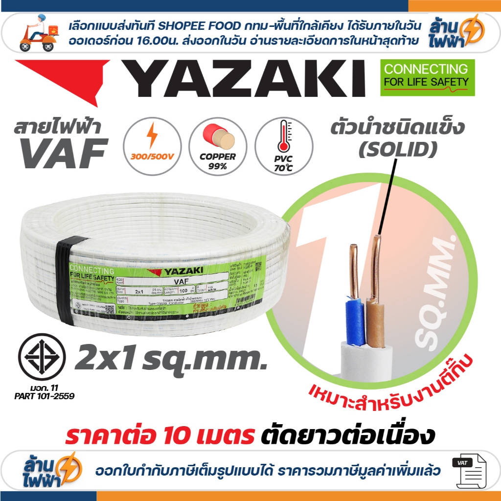 (ราคาต่อ 10เมตร ตัดยาวต่อเนื่อง) THAI YAZAKI สายไฟ VAF ขนาด 2 x 1 / 2 x 1.5 / 2 x 2.5 / 2 x 4 sqmm ทองแดง ไฟฟ้า ตีกิ๊บ