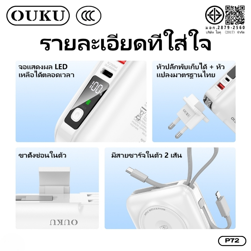 OUKU P72 6in1 พาวเวอร์แบงค์ไร้สาย 60w ชาร์จไว 15000mAh พาวเวอร์แบงค์ มีสายชาร์จและปลั๊กในตัว [China CCC]