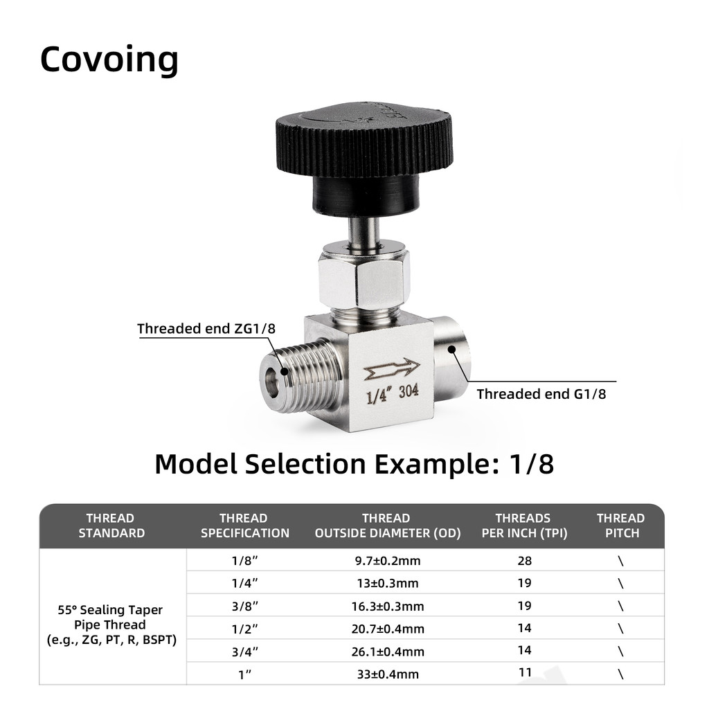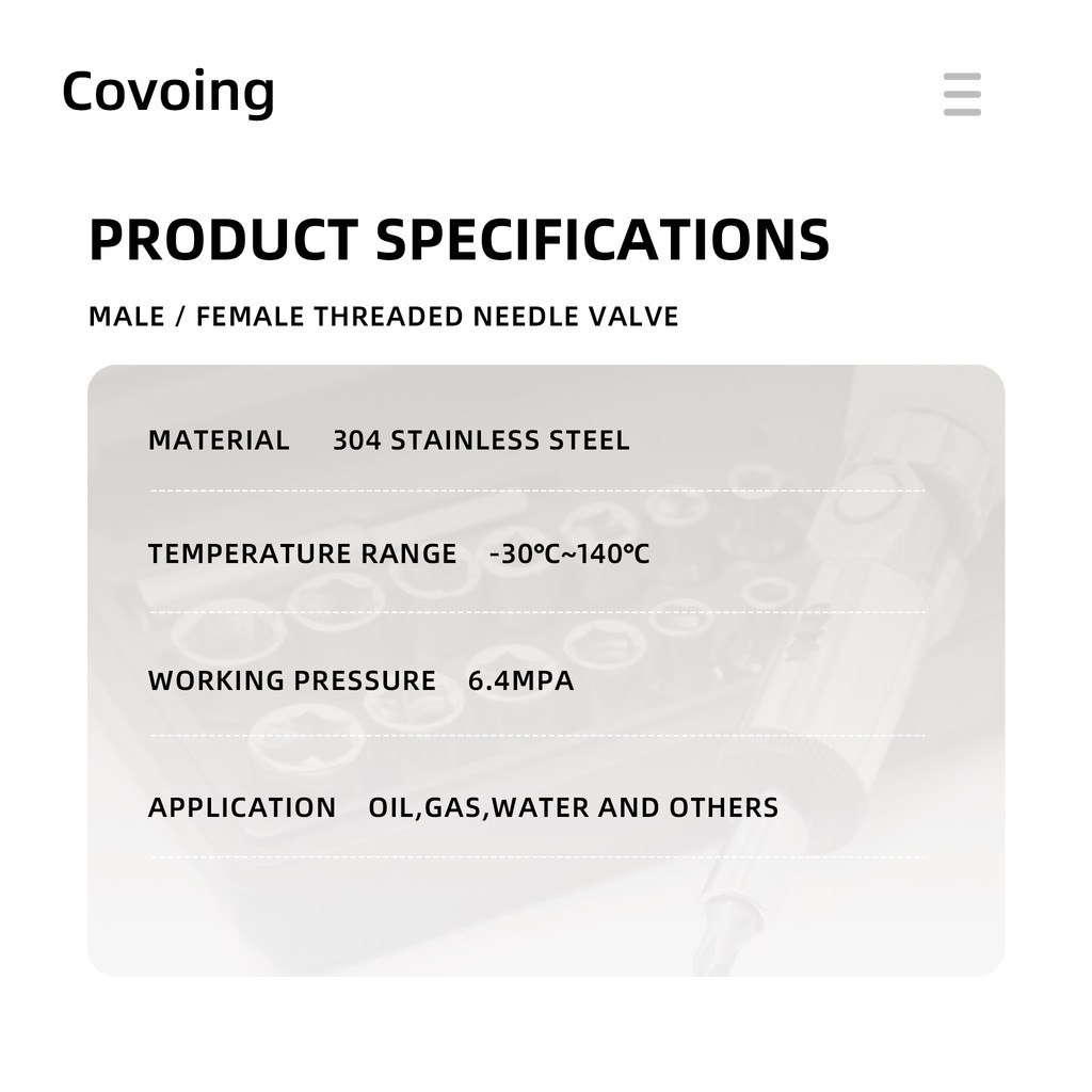 Covoing วาล์วเข็มแรงดันสูง สแตนเลส 304 เกลียวใน เกลียวนอก วาล์วควบคุมอัตราการไหล สำหรับระบบน้ำ น้ำมัน แก๊ส ขนาด 1/4 1/2 3/4 นิ้ว
