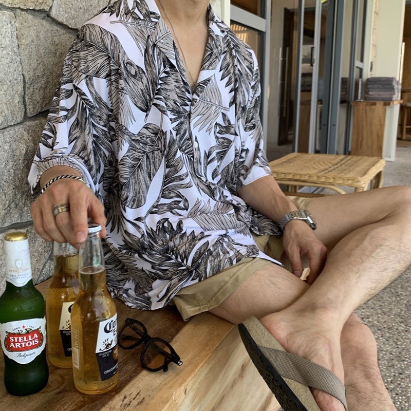 เสื้อฮาวายแขนสั้นผู้ชาย ลายดอกไม้ ดีไซน์ทรงหลวม