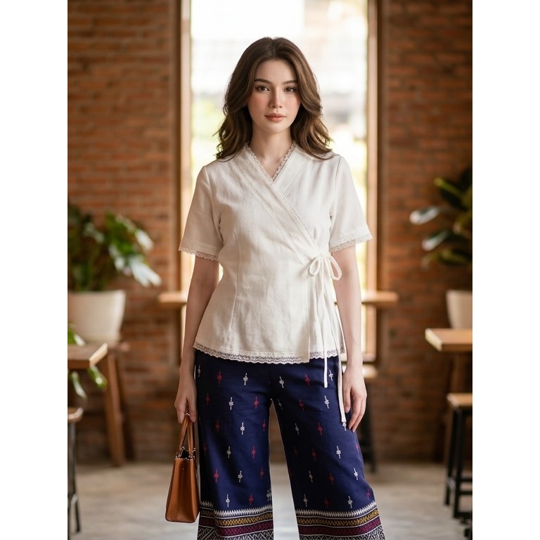 ชุดผ้าไทยประยุกต์ “ศรีจันทร์คราม” เสื้อป้ายผ้าฝ้าย + กางเกงผ้าพื้นเมืองลายโบราณ