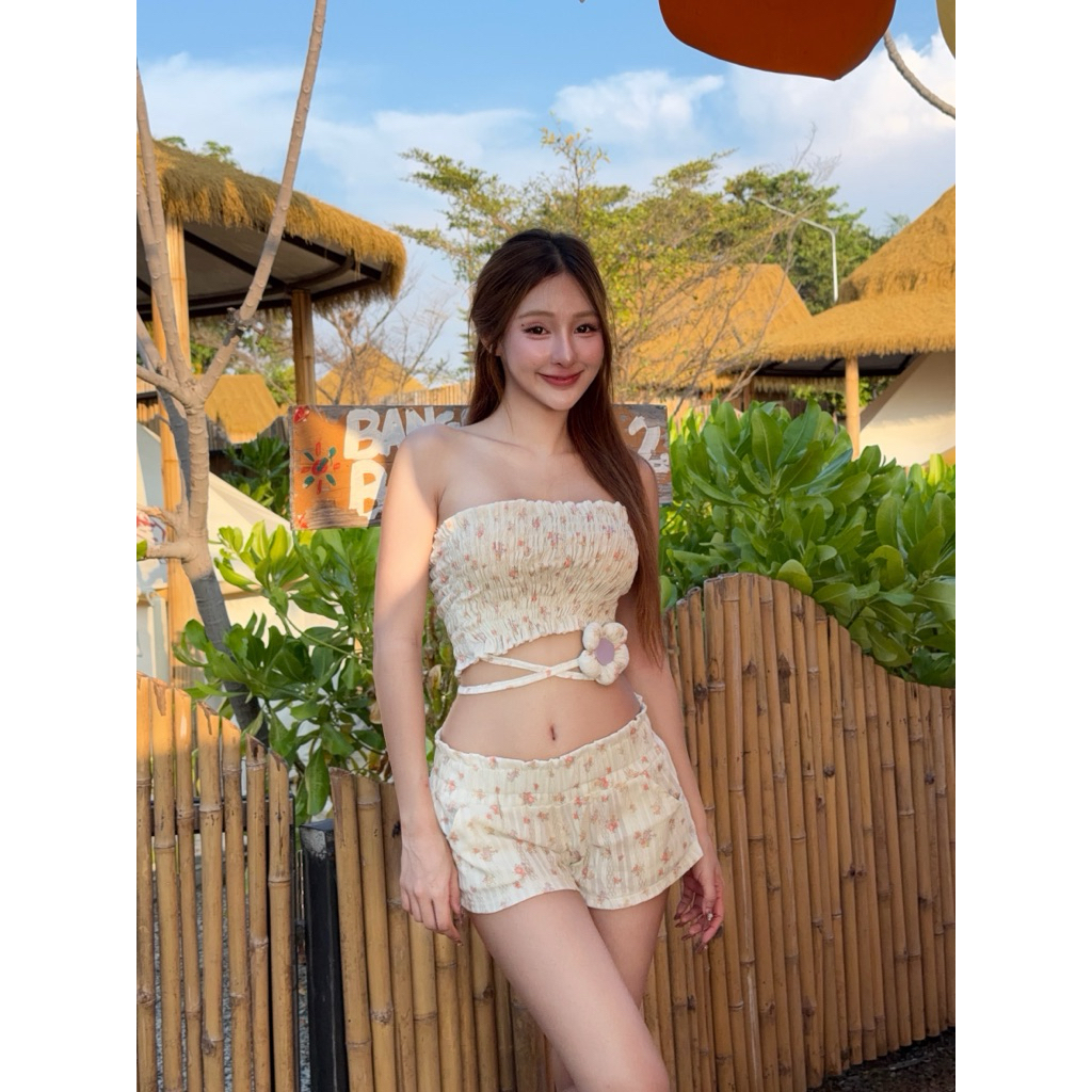Petite♡︎ Lovely set ชุดเซ็ตเสื้อเกาะอกสม็อค+กางเกงขาสั้น แต่งไขว้เอวดอกไม้