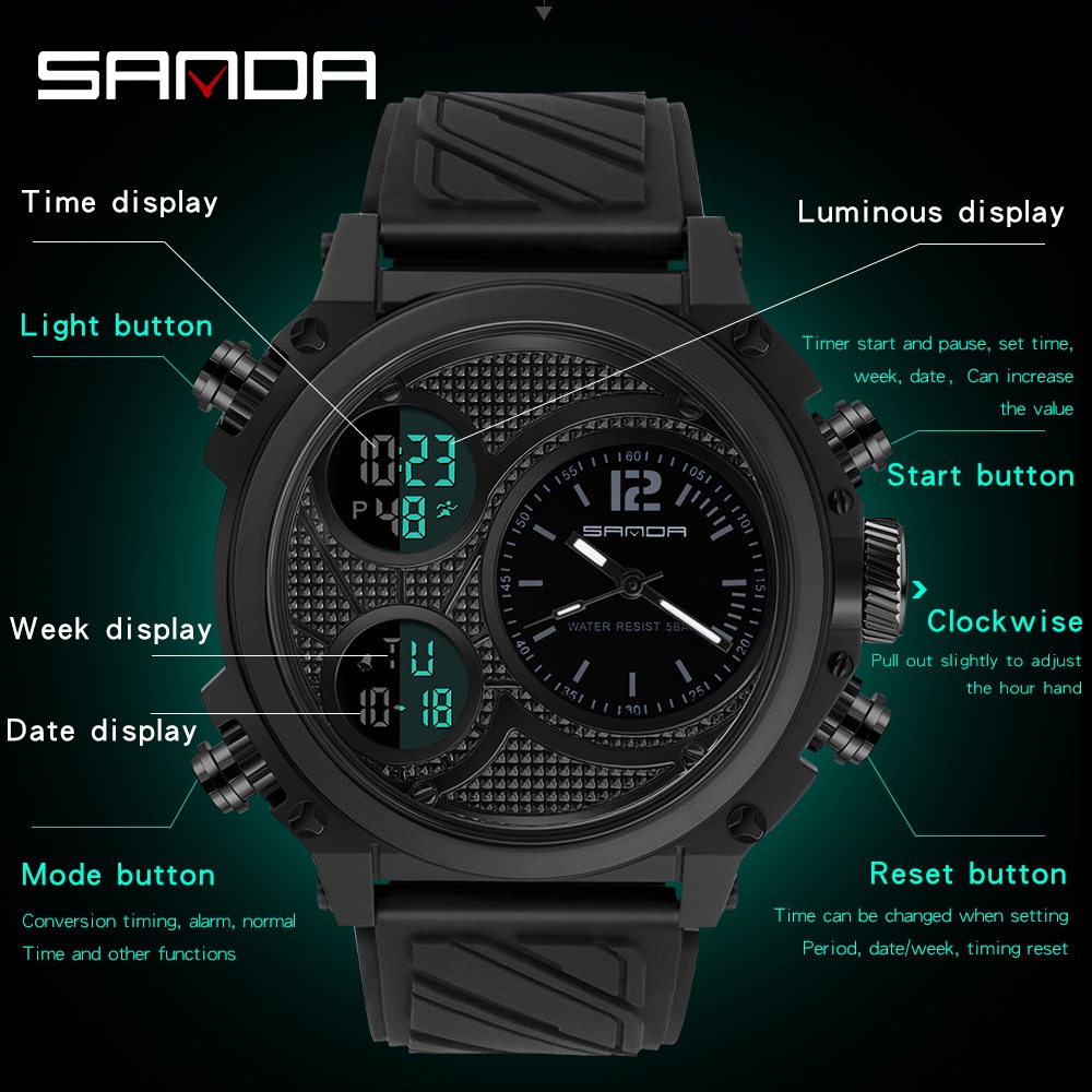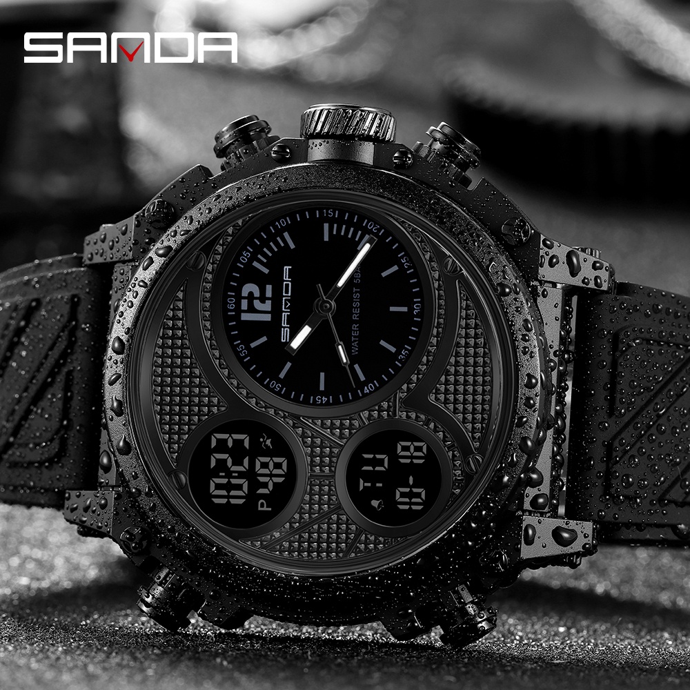 Sanda ชายแฟชั่นแบรนด์หรูทหารนาฬิกากันน้ำจอแสดงผลคู่ชายกีฬานาฬิกา