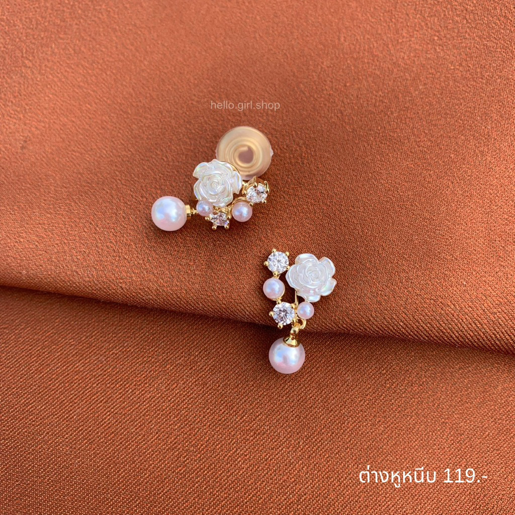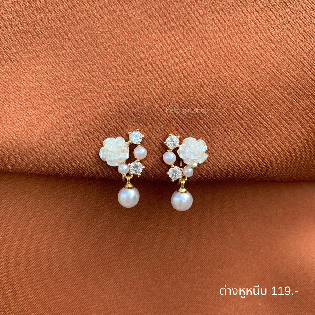 ( ต่างหูหนีบ ขดลวด ) ต่างหูดอกไม้ ห้อยไข่มุก