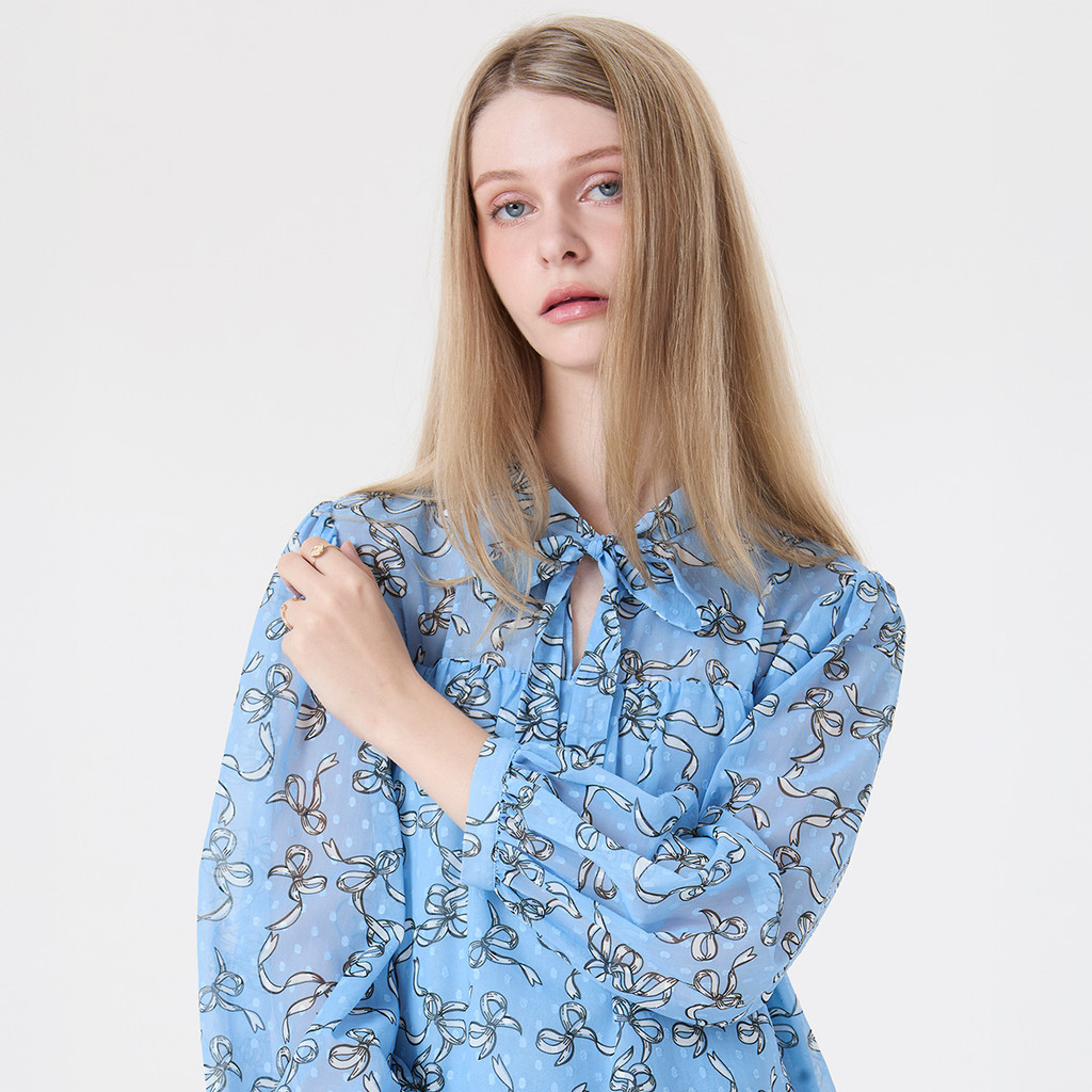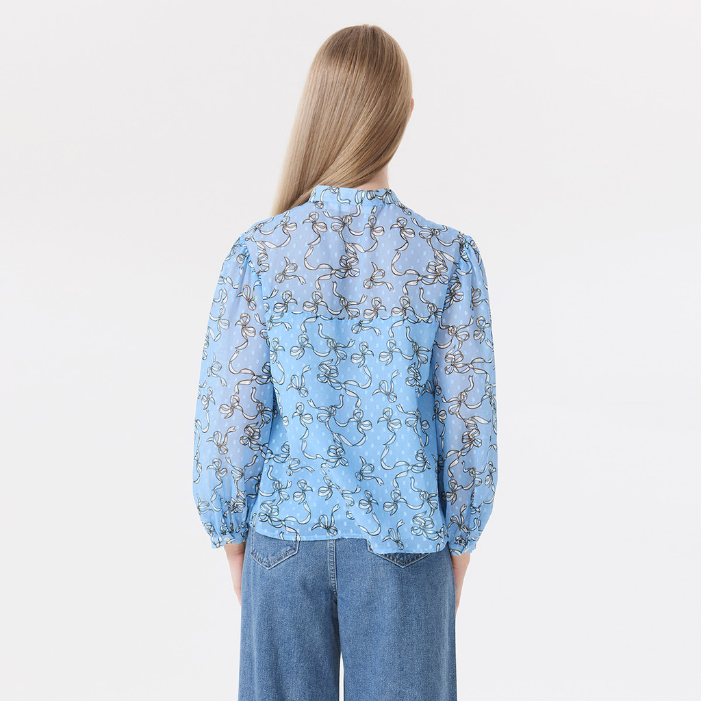 EP เสื้อเบลาส์ลายพิมพ์โบว์ ดีไซน์ผูกโบว์ช่วงคอ ผู้หญิง สีฟ้าอ่อน | Bow Print Blouse with Tie-Neck Bow | 05076