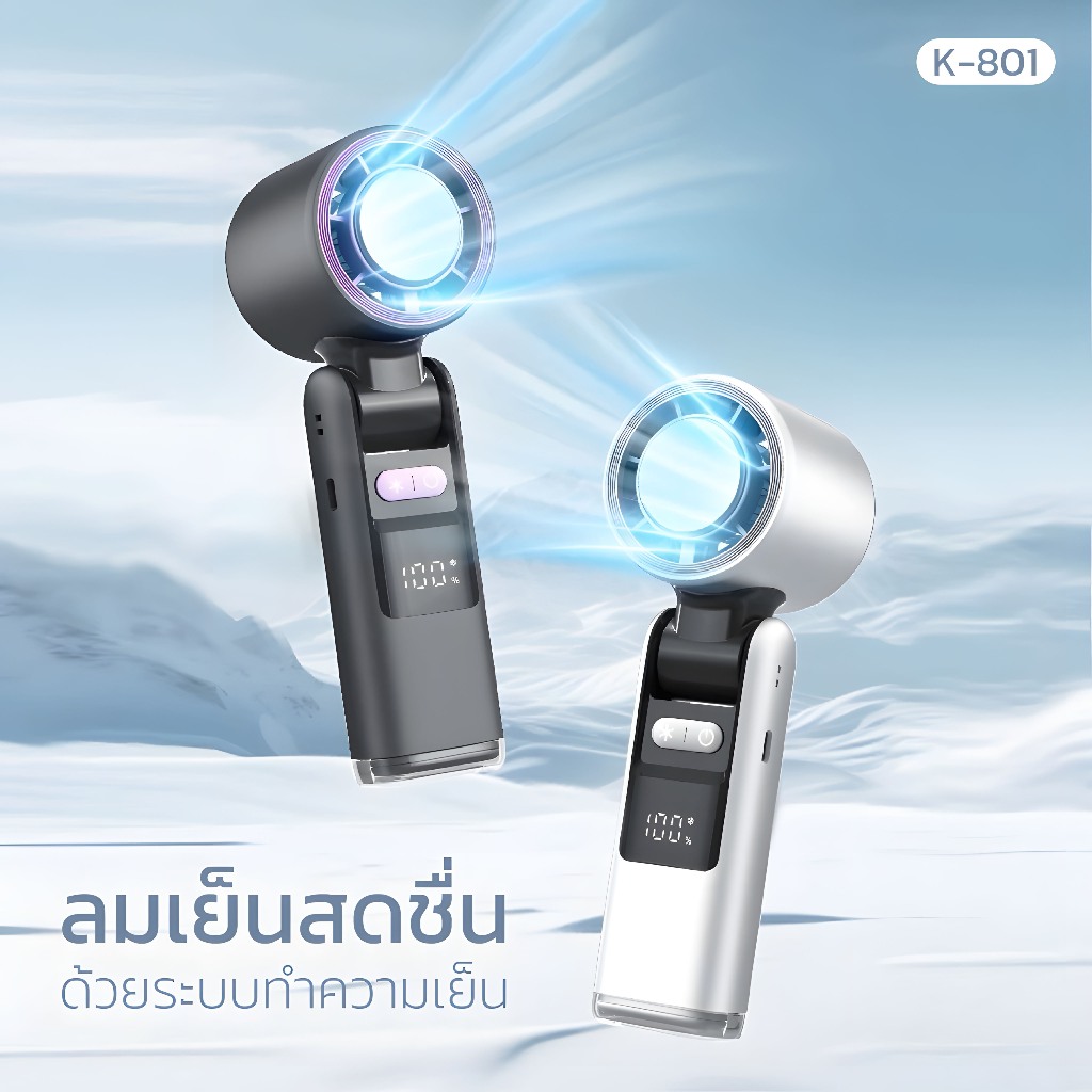 พัดลมไอเย็นพกพา Handheld fan รุ่น k-801 มีไฟฉายในตัว ปรับระดับความเเรงได้100 คล้องคอตั้งโต๊ะ มี 3 สี โหมดก้อนน้ำแข็ง